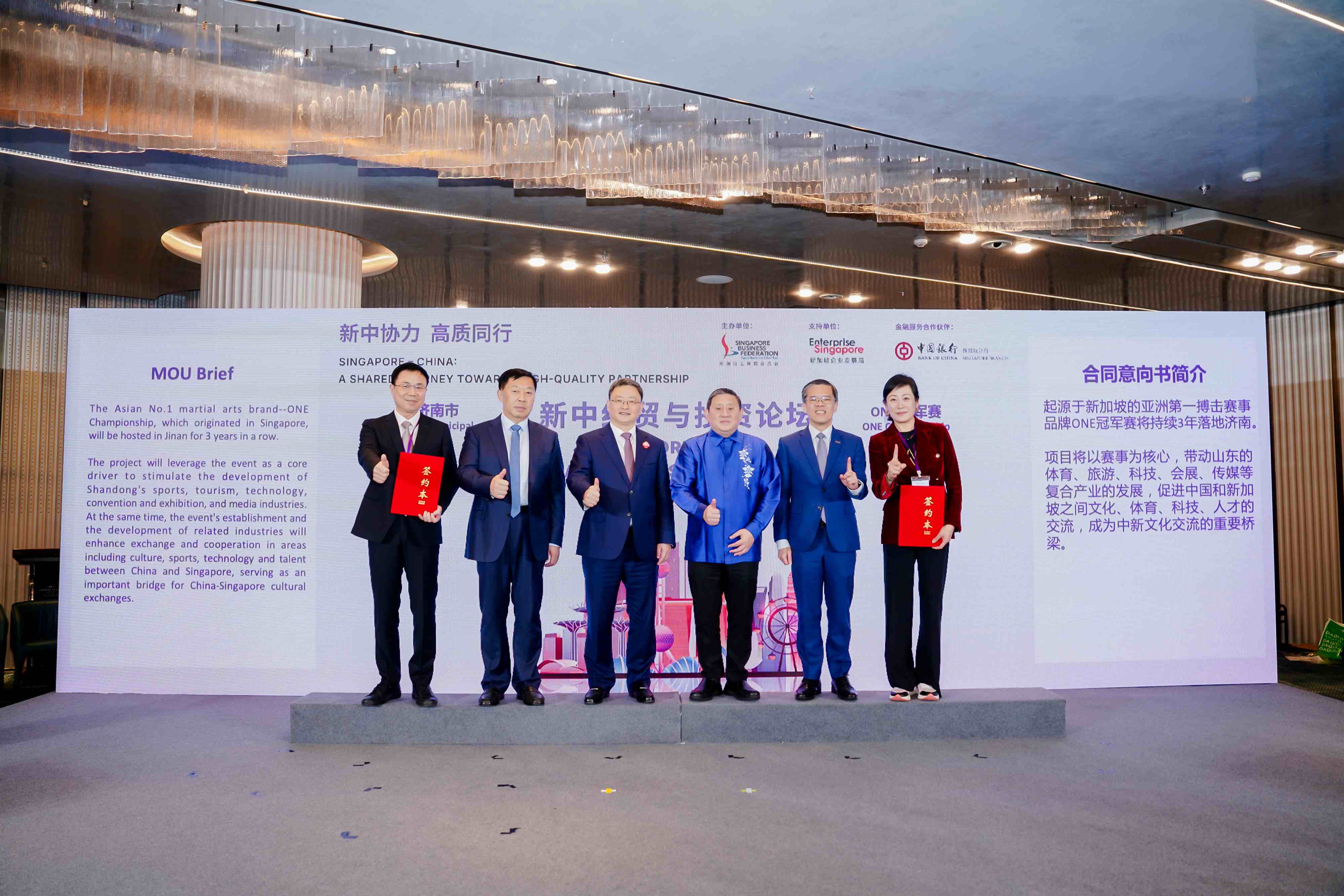 新中协力,高质同行。11月6日,于第七届中国国际进口博览会期间举行的新中经贸与投资论坛上,诞生于新加坡的全球著名体育IP-ONE冠军赛与山东省济南市正式达成战略合作协议。现场,ONE冠军赛中国区执行总裁李颖与济南市体育局局长董怀敏正式签约。