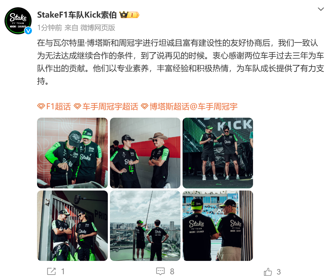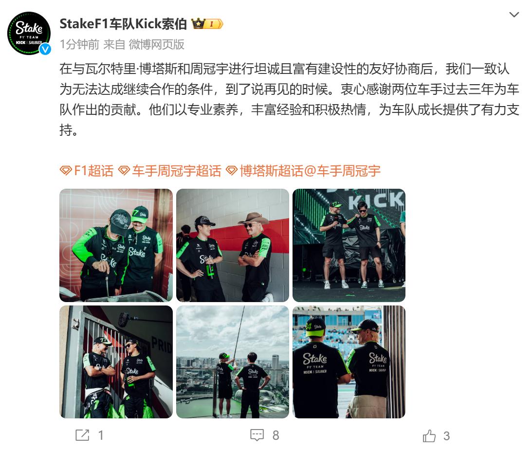 索伯车队写道:“在与瓦尔特里·博塔斯和周冠宇进行坦诚且富有建设性的友好协商后,我们一致认为无法达成继续合作的条件,到了说再见的时候。衷心感谢两位车手过去三年为车队作出的贡献。他们以专业素养,丰富经验和积极热情,为车队成长提供了有力支持。”