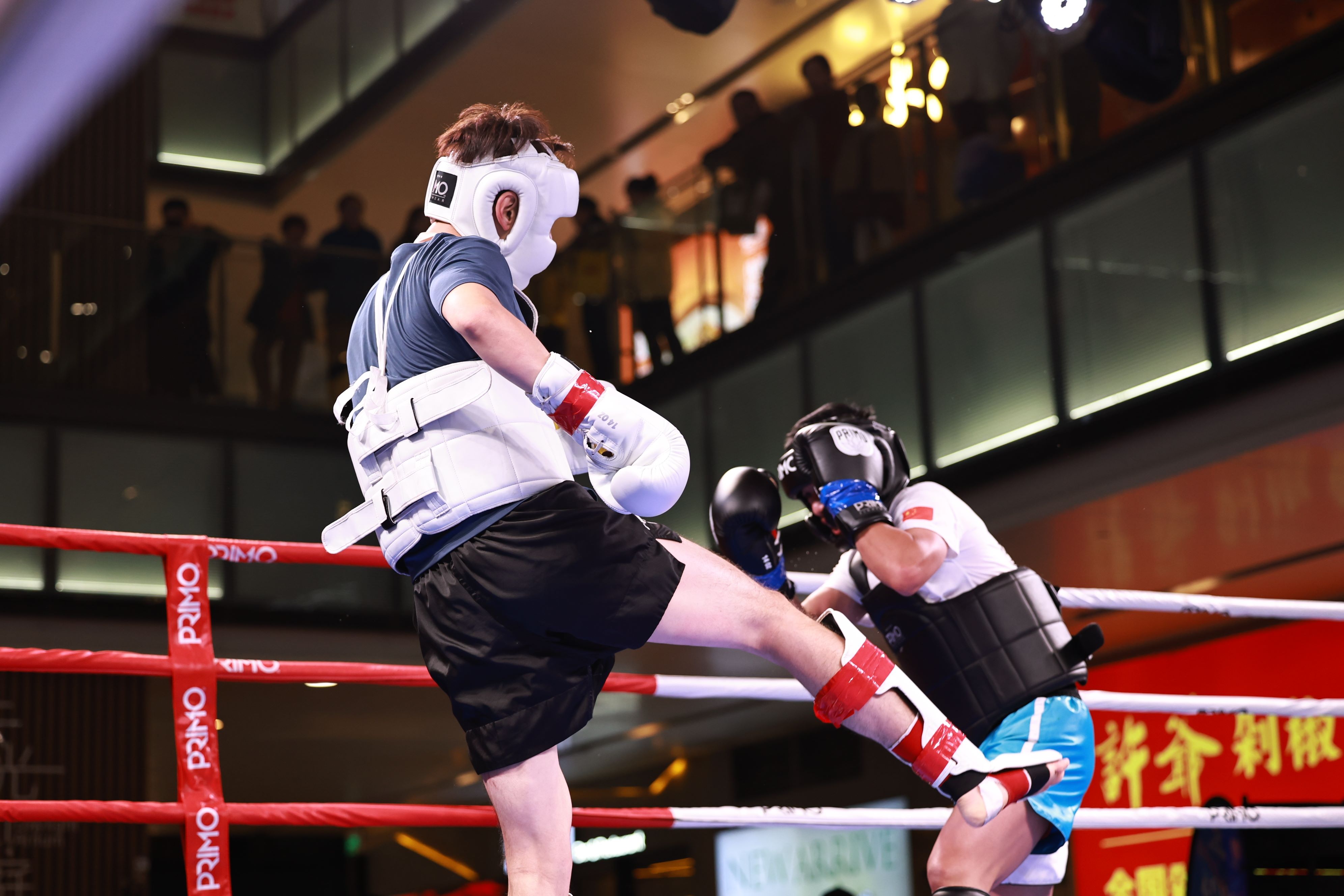和上半年的2024年上海市第四届市民运动会市级选拔赛相似,这次举办的拳击项目总决赛同样放在了商圈的中庭位置举办,高耸的拳击台,绚丽的舞美灯光,闪亮的四方屏等等都吸引着商场里过往市民的目光。