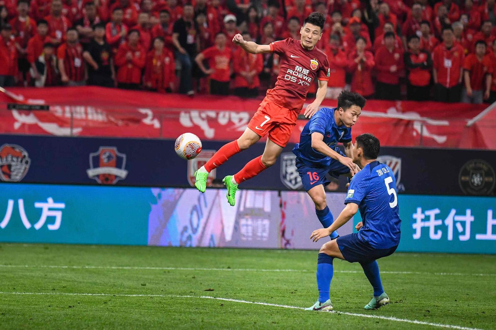 武磊在今年的上海德比与申花球员对抗。劳动报记者颜筱依 摄影