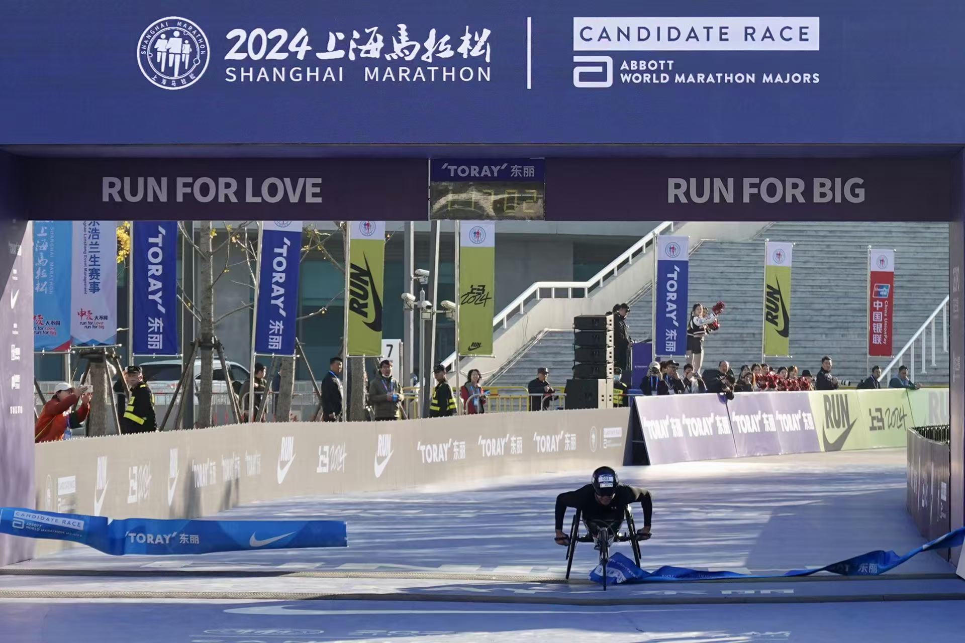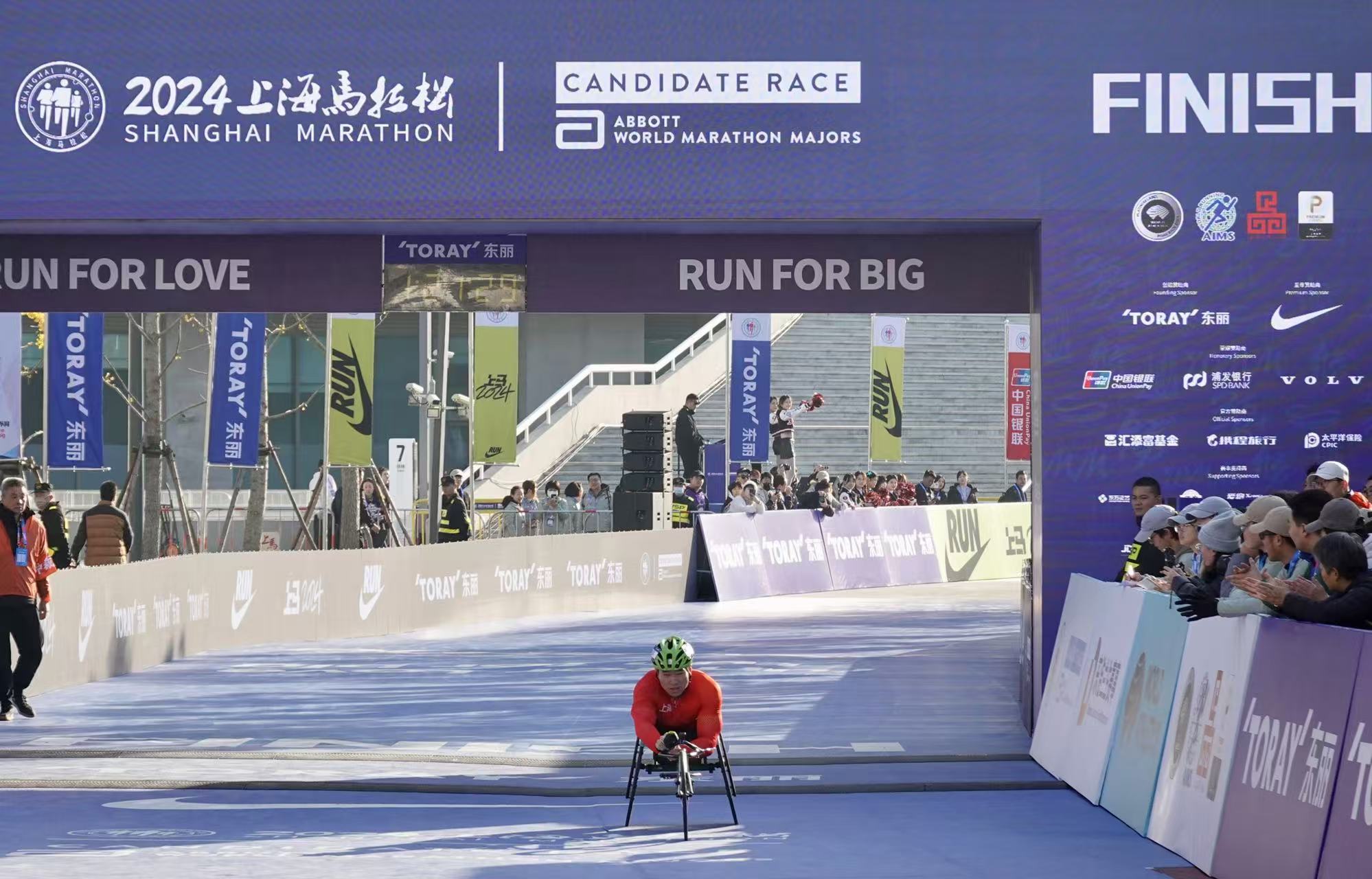 竞速轮椅选手代云强冲过2024上海马拉松终点线。劳动报记者贡俊祺 摄影