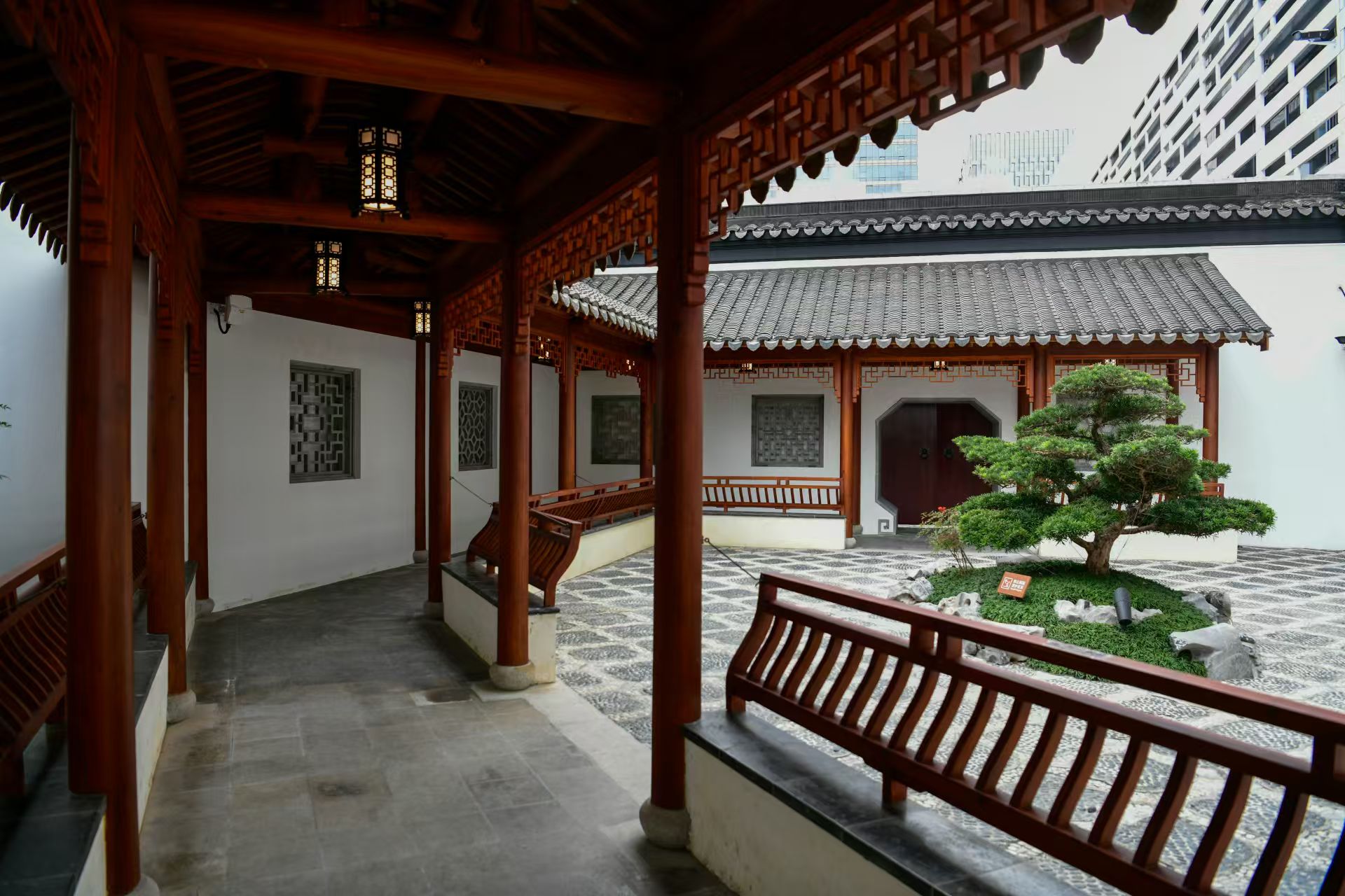 这一处幽居闹市的江南新古典园林“云林”,已然是观众拍照打卡的必到景点之一:西边是小桥流水、亭台楼阁;东边是兼具演出、会客功能的开放庭院,院落尽头矗立着一处仿古戏台。跨出一道门,一条螺旋形的环形坡道连接起了三、四、五层的室内空间,实现了建筑空间与城市空间的互动。
