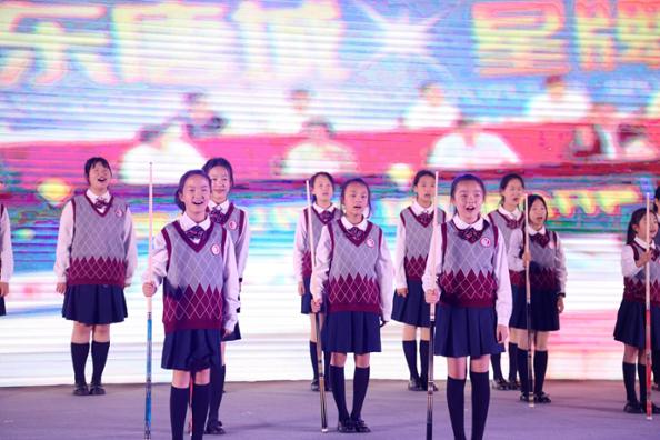 唐镇中学的学生表演9球中国公开赛会歌《放飞9球》。受访对象图