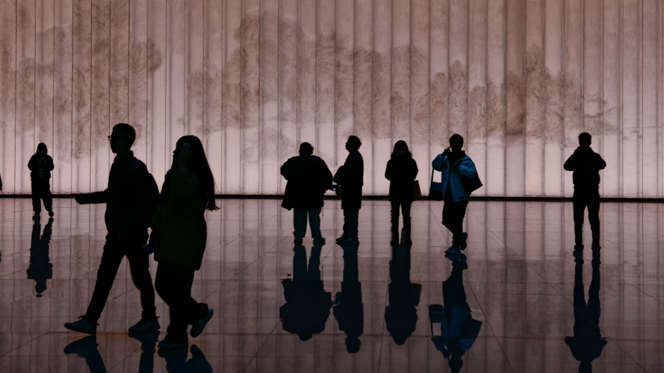 一楼大厅中,一面极具水墨色彩的巨幅光影幕墙徐徐展开。