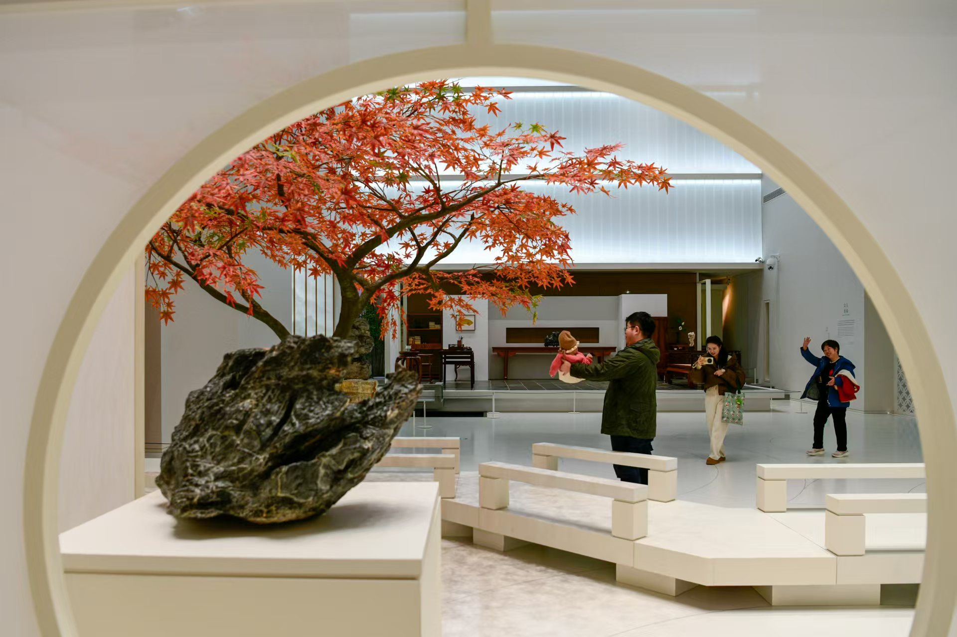 江南造物馆展厅面积达1649平方米,其中包括一个中心挑高15.4米、面积290平方米的中庭,以及一条长约30米的外光廊道。这是东馆中唯一引入自然光线并可观赏户外景观的文物展厅。劳动报记者颜筱依 摄