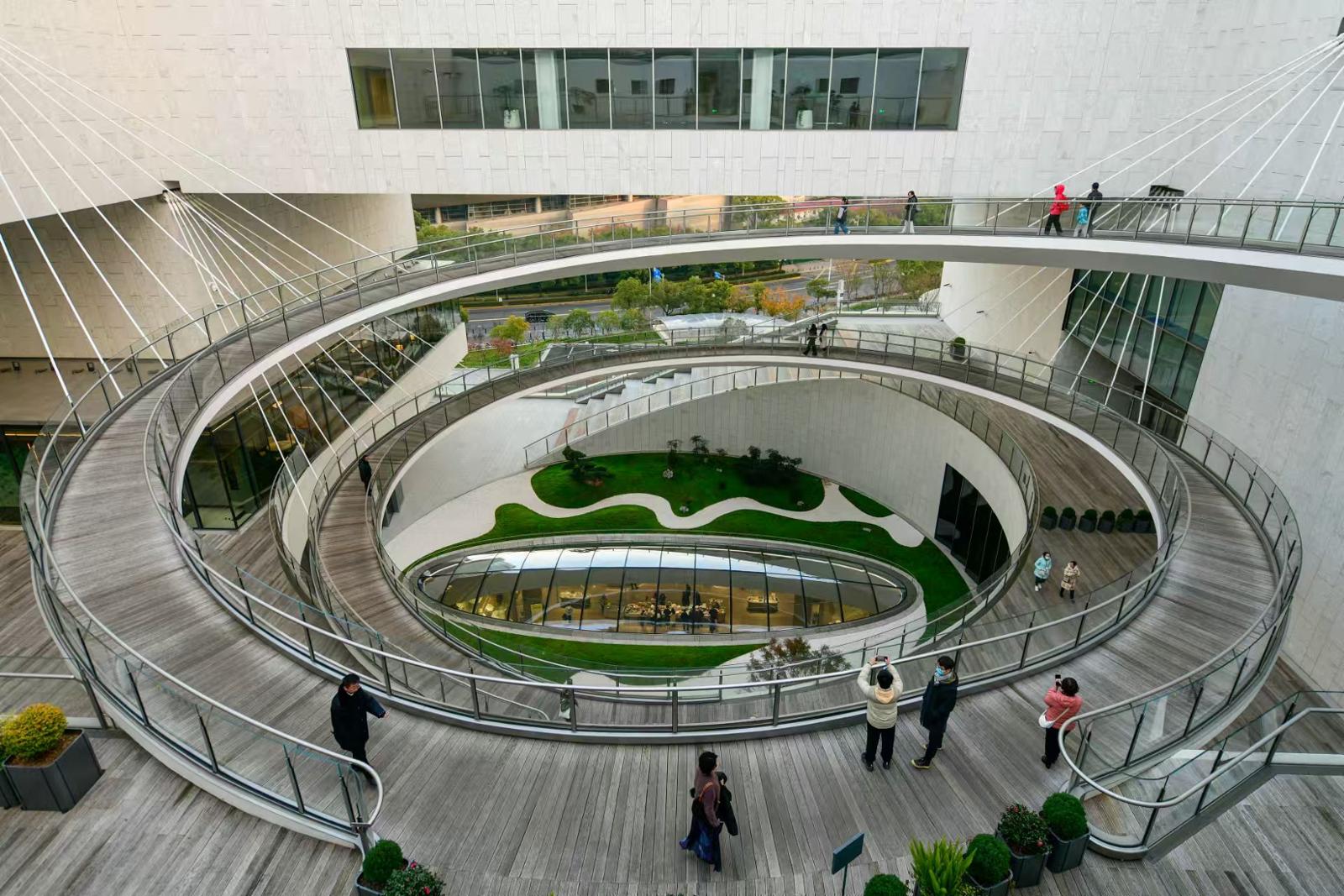这座巨大的旋转坡道,是三楼通向五楼的休闲步道,目前已成为新晋“网红打卡点”。其实这还是对上博本馆的一种延伸。1996年开放的上博人民广场馆,建筑造型一大亮点是方形基座上托起圆柱形顶部,取“天圆地方”之意。而东馆的建筑主体呈矩形体块,中间嵌入圆形的旋转坡道,也是方和圆的结合。劳动报记者颜筱依 摄