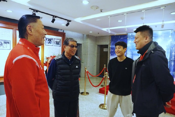 根宝、武磊与市体育局副局长罗文桦、市足协主席柳海光交流。海港俱乐部图