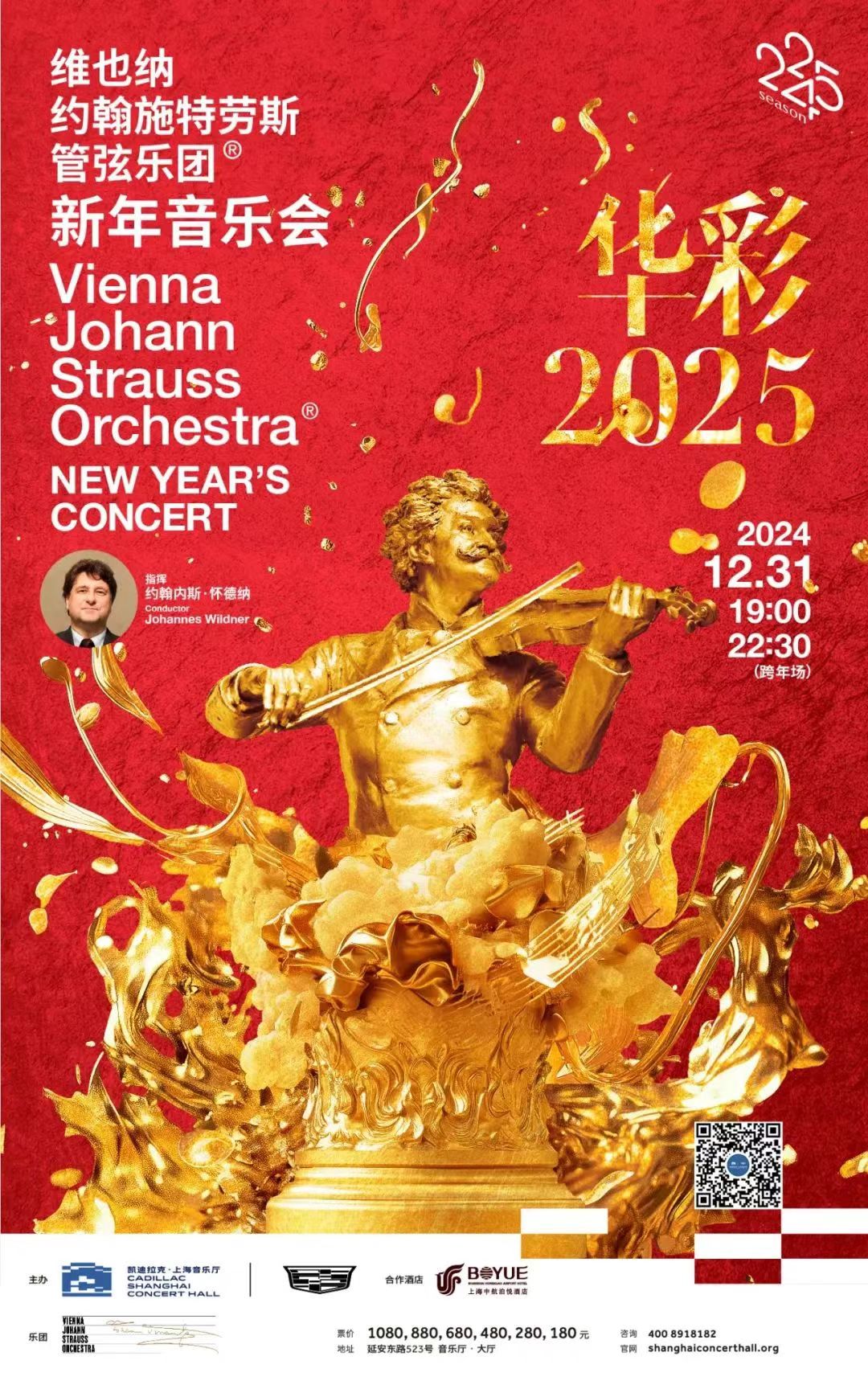 值得一提的是,当晚,上海音乐厅内,维也纳约翰施特劳斯管弦乐团新年音乐会将连演两场, 22:30的跨年场,乐团指挥约翰内斯·怀德纳还将在零点时分撒下寓意甜蜜美满的糖果,和观众一起迈向华彩2025。
