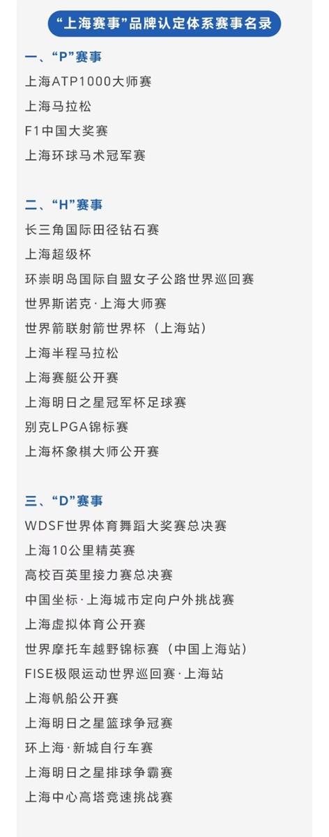 “上海赛事”品牌认定始于2021年,是上海加快推动体育赛事管理创新的重要举措,也是上海“3A”(认定-评估-扶持)体育赛事管理闭环的关键组成。“上海赛事”品牌认定体系将赛事与城市发展紧密融合,结合城市特色将赛事分为“P”赛事、“H”赛事和“D”赛事,并在此基础上形成了“成熟一批,认定一批”的工作机制。经过本轮赛事认定工作,目前“上海赛事”品牌认定体系包含“P”赛事4项、“H”赛事10项、“D”赛事12项。