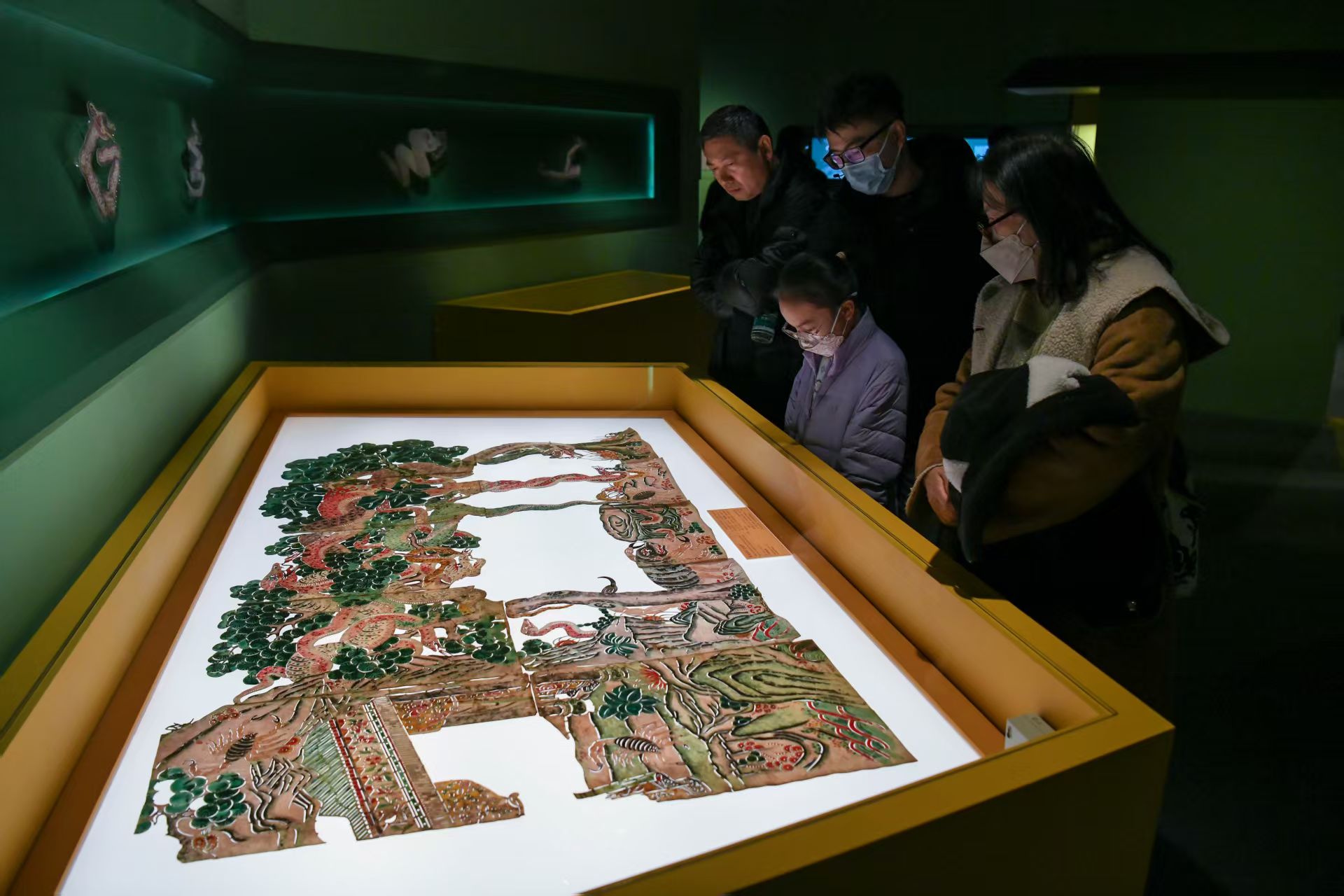 头图为市民打卡上海博物馆“灵影仙踪:上海博物馆蛇年迎春展”,与“伏羲与女娲捧日月”画像石拓片自拍合影。