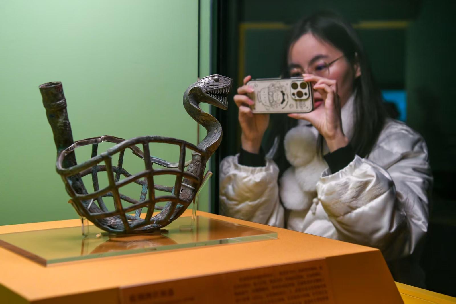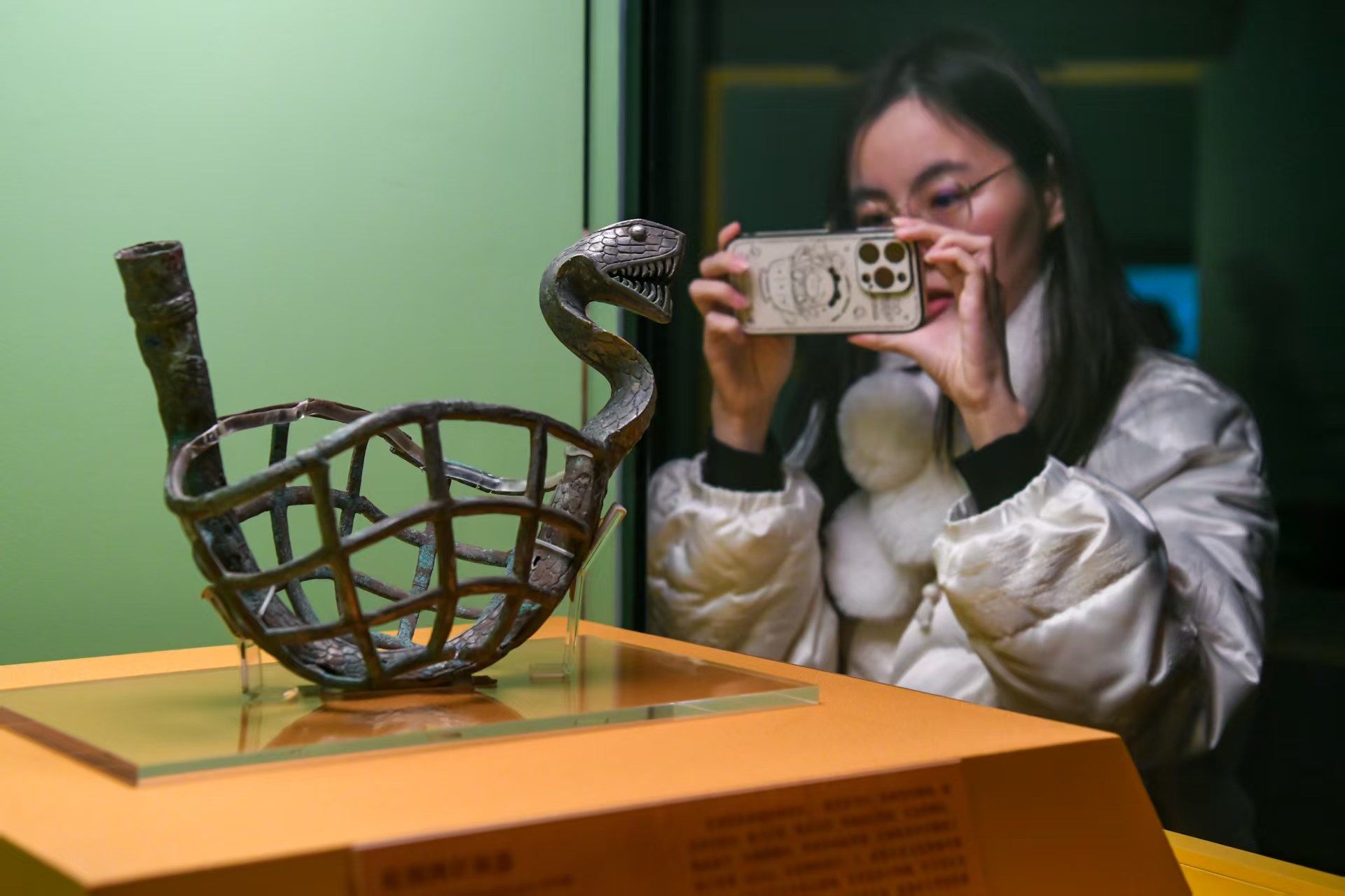 观众打卡“蛇纲网状铜器”。劳动报记者 颜筱依 摄影