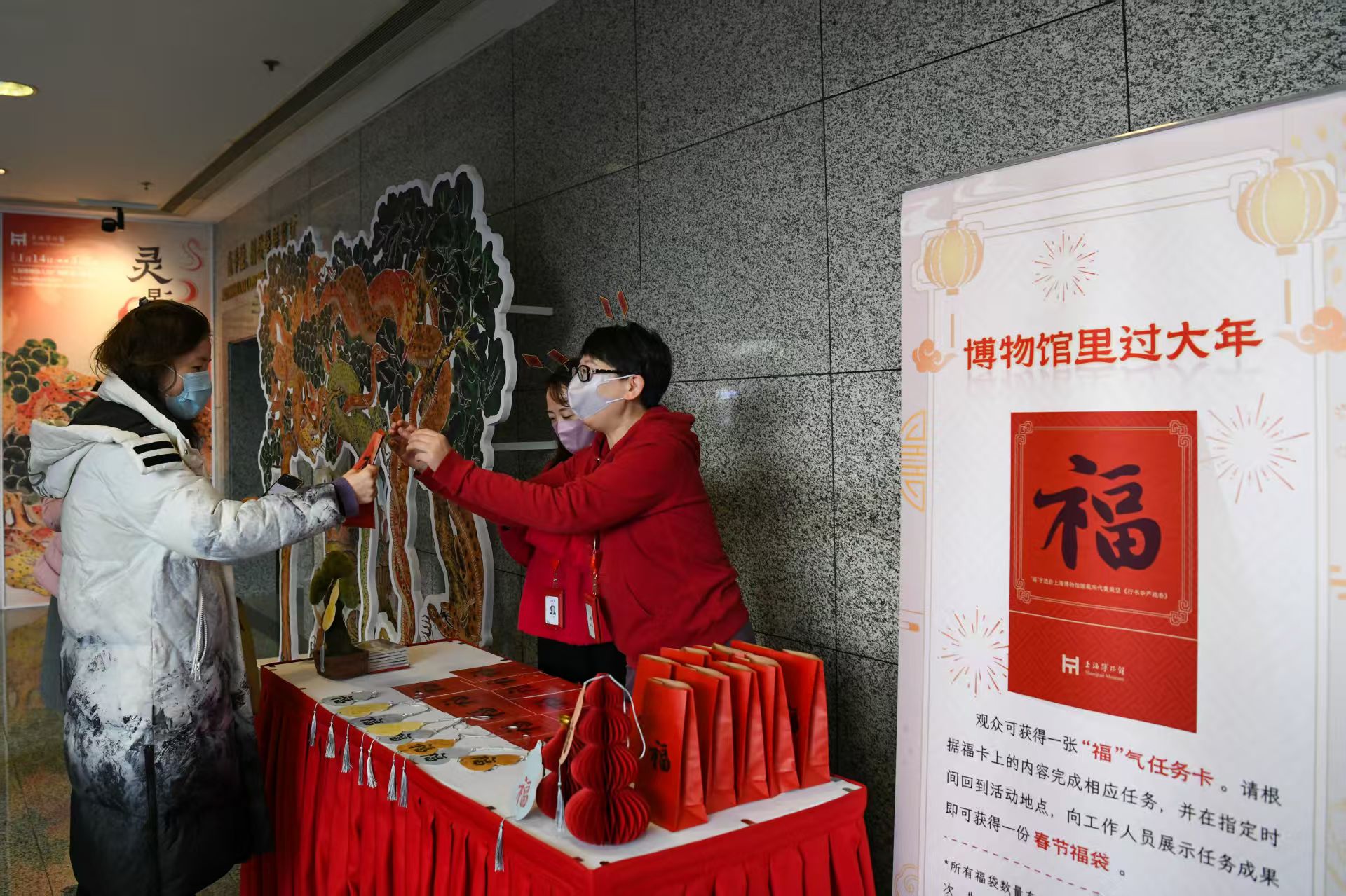 “博物馆里过大年”的互动活动上,工作人员为观众派发福袋。劳动报记者 颜筱依 摄影