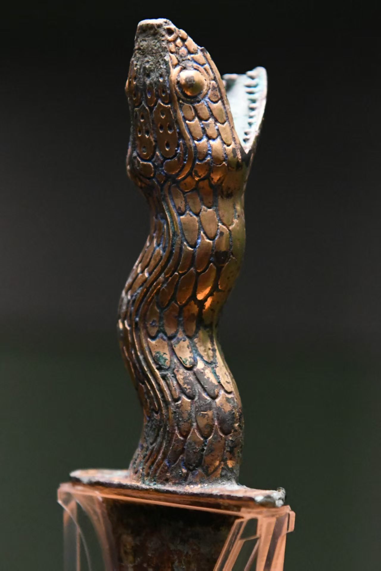 鎏金蛇头铜柄。劳动报记者 颜筱依 摄影