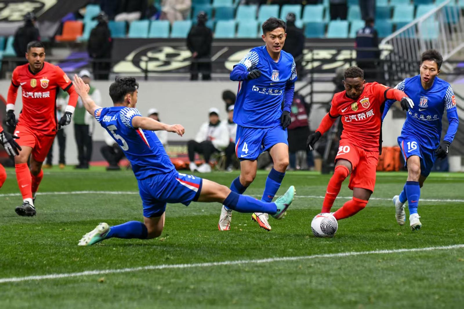 新加盟上海申花队的外援米内罗(右)在首秀中表现积极。劳动报记者颜筱依 摄影