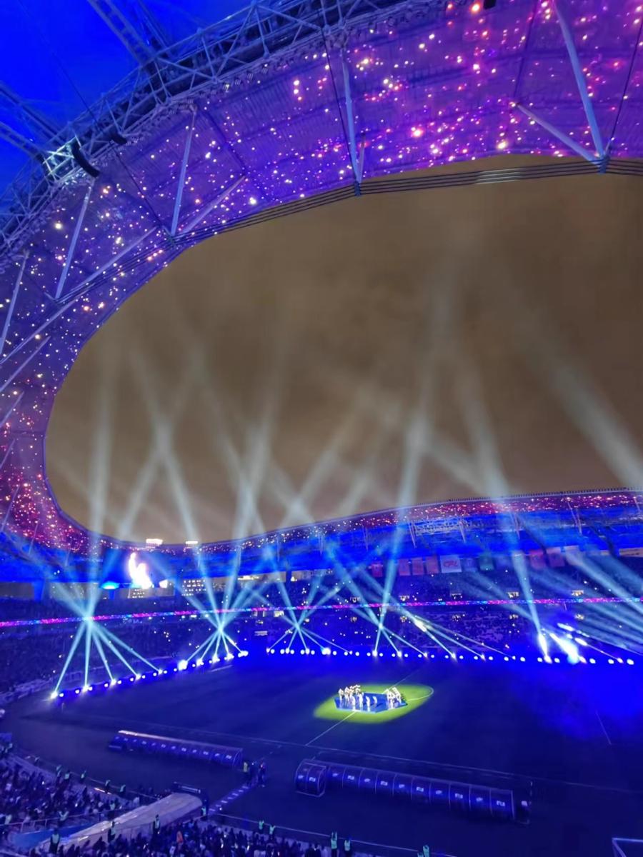 顺着人流往徐家汇体育公园走,足球的热浪更加滚烫。可容纳8万人的场馆里,一半看台都被填满。头顶的360度环形天幕上星光璀璨,主办方通过声、光、电配合打造了一场美轮美奂的开幕秀,尽展足球运动的激情与活力。而当晚最受期待的“火神杯”亮相也充满了仪式感,由强巴旦增、旦增班久、阿旺措加、旦增曲美4位来自西藏定日地震灾区的藏族学生手捧着送达绿茵场,虽是短短几步却传递了温暖和爱。