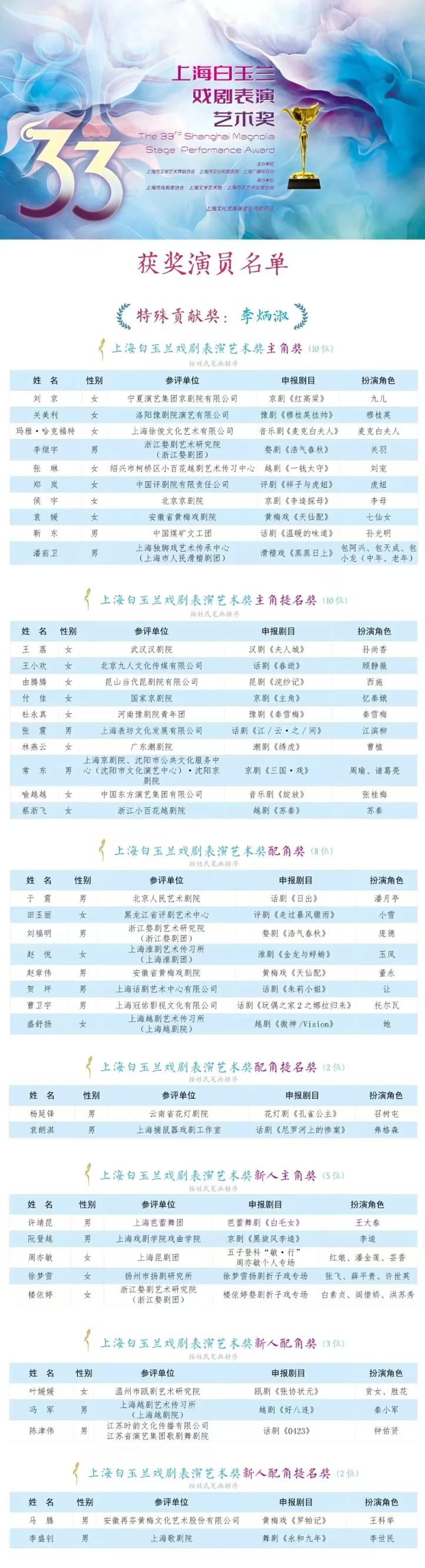 今年花落谁家?第33届上海白玉兰戏剧表演艺术奖获奖完整名单来了