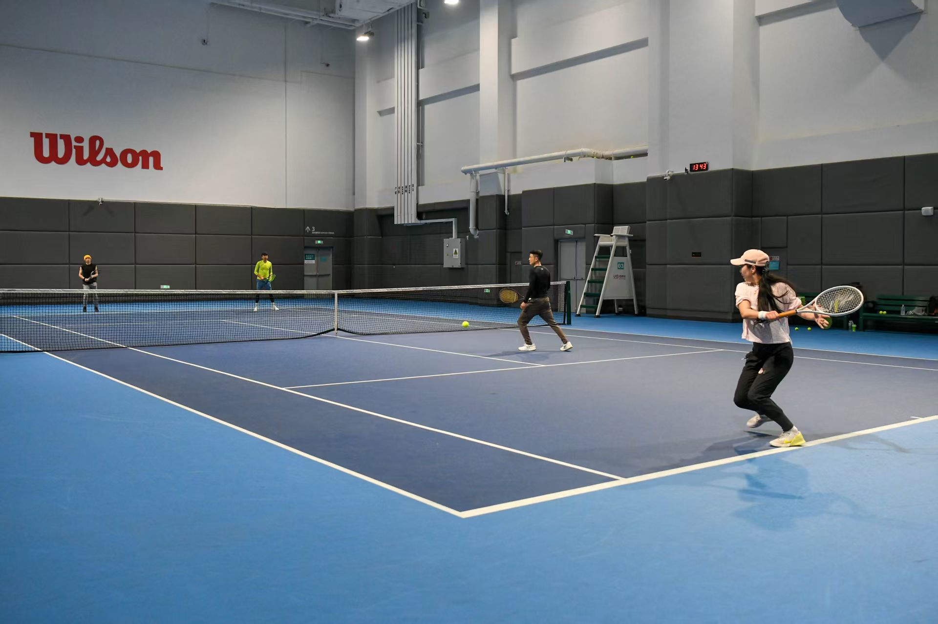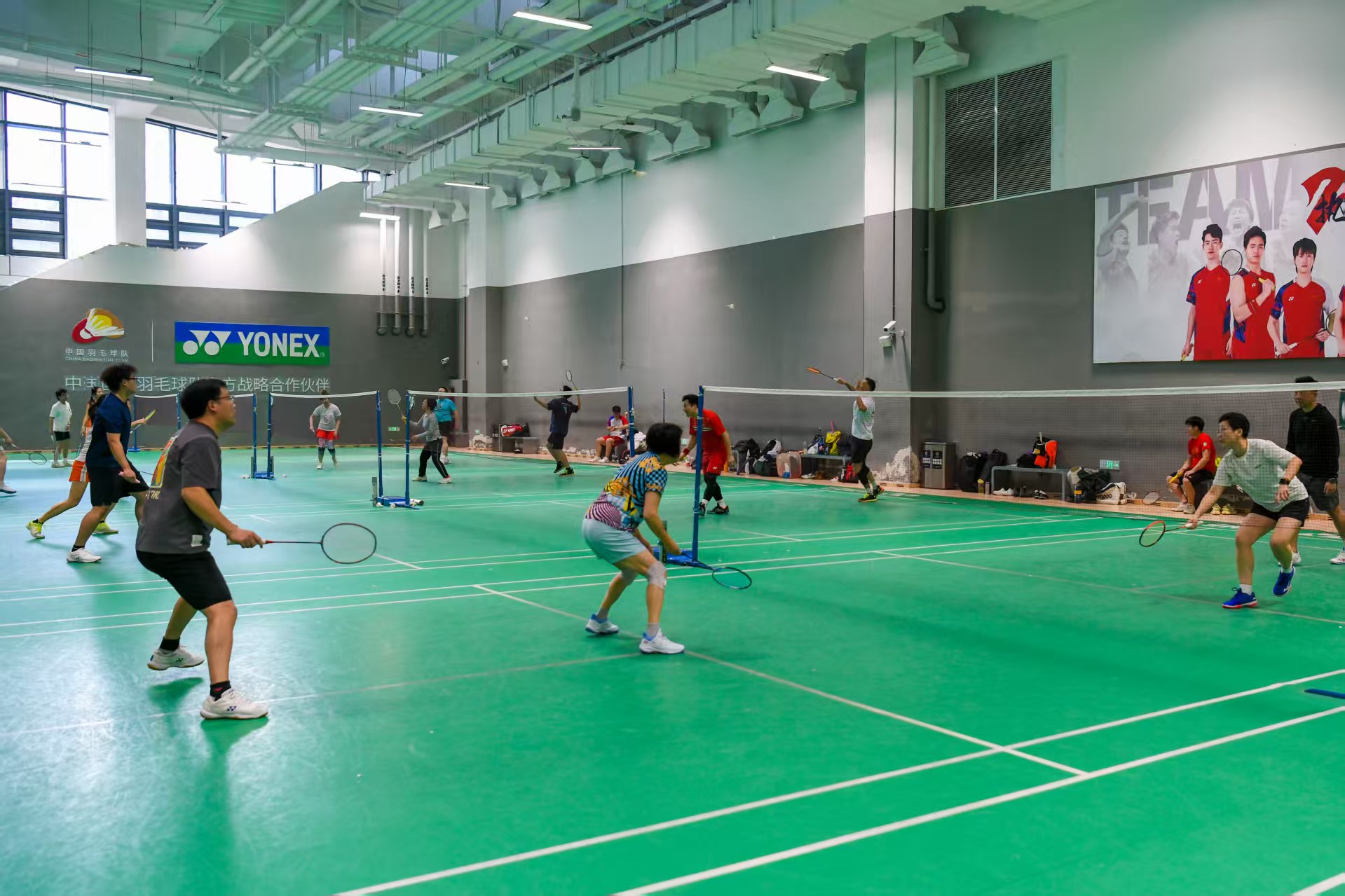 场馆内部的场地设施都达到专业赛事标准。以羽毛球馆为例,地面满铺实木地板和品牌运动地胶,全年恒温管理,不用担心天气太冷或者太热。