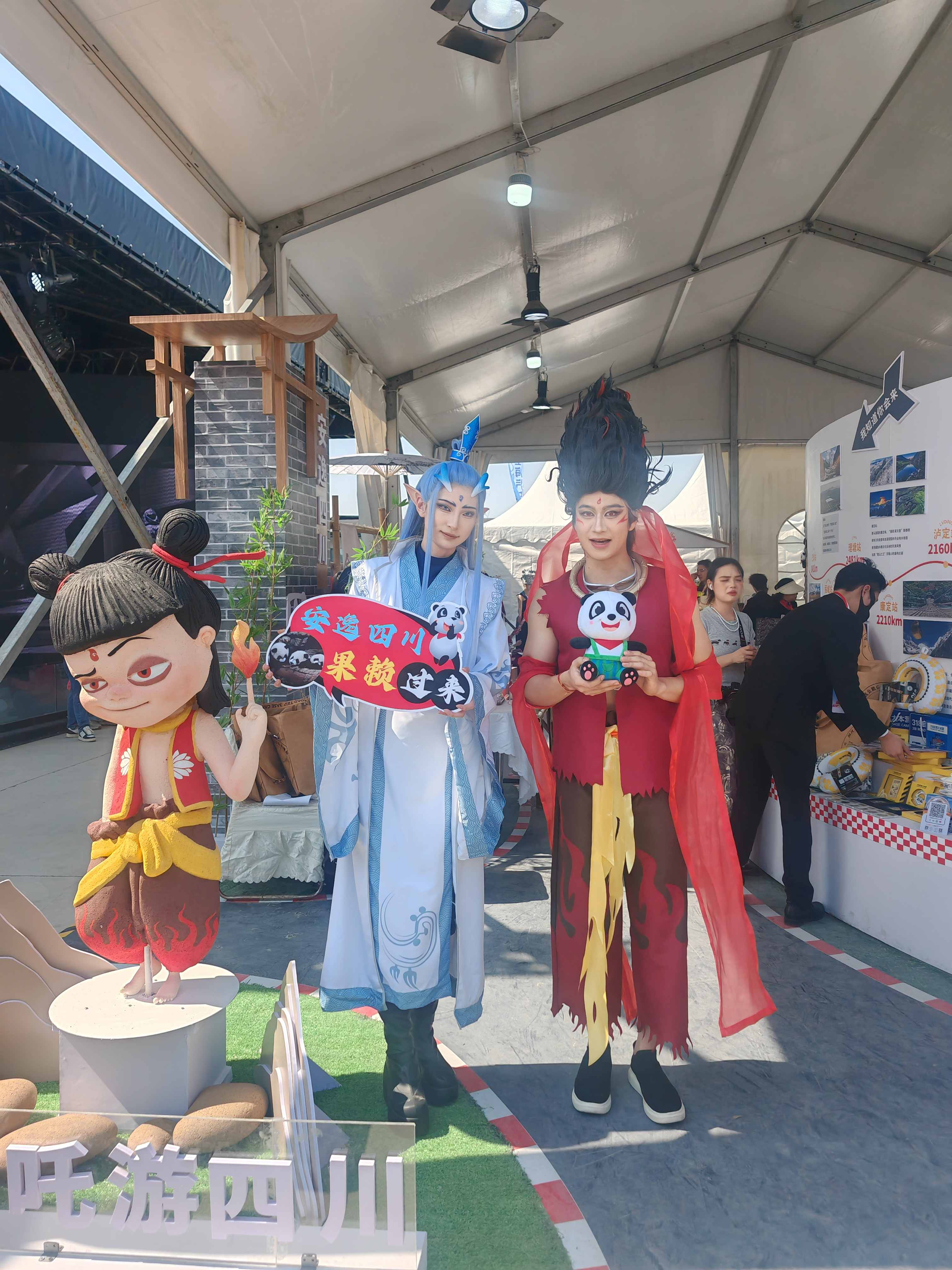 为了接住这破天的“流量”,四川文旅局也与上海文旅局联系,首次参展,推介四川文旅的一些特色资源,现场派出的大熊猫玩偶和民族服饰很受欢迎,哪吒和敖丙等卡通人物,也闪亮登陆现场。