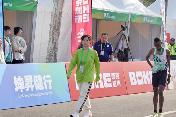 志愿者带领精英选手离开终点。劳动报记者贡俊祺 摄影