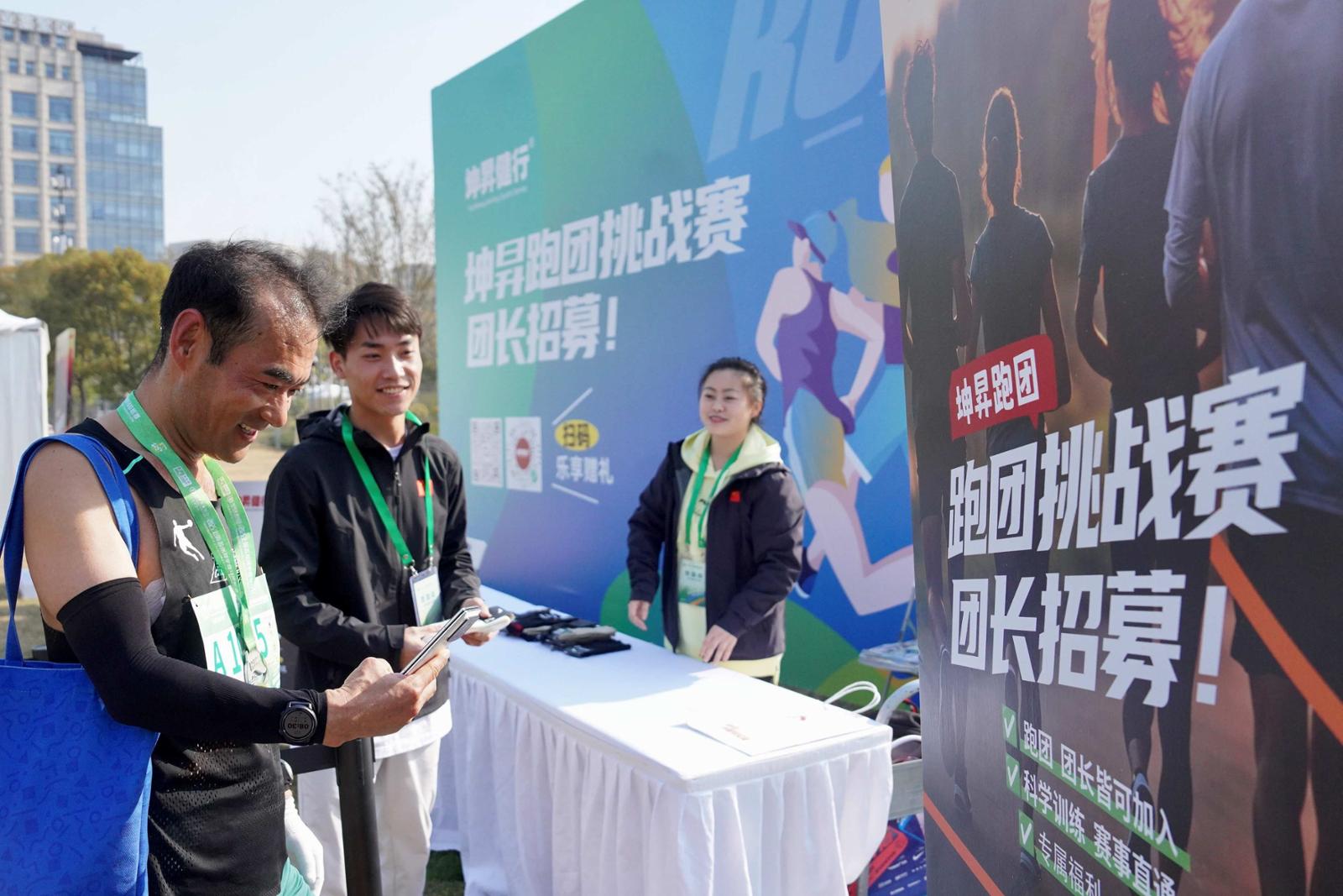 头图为完赛选手在坤昇健行展台参与活动。劳动报记者贡俊祺 摄影