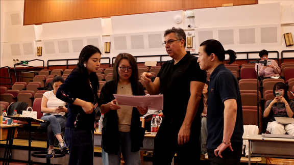 在此次上音版《茶花女》排演过程中,“联合指导”展现出合力优势。国际导演与本校教师共同指导,意大利导演马埃斯特里尼、中方导演林梅仔细打磨每一场戏,增加了许多戏剧细节,排练指导、作曲指挥系教师管珺全程跟进,声乐歌剧系教授王凯蔚、黄萱现场给予音乐指导和督促,各系部专业老师也来到现场,观摩排练进展,掌握学生们实践的反馈,排练现场成了教学课堂的高效延伸。