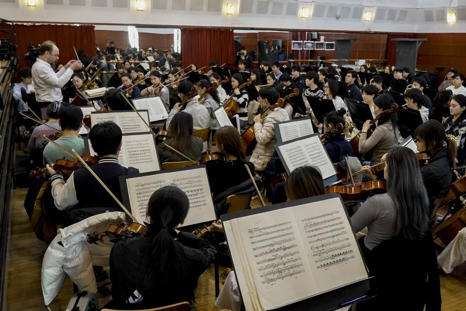 头图为来自芬兰的指挥家维勒·马特维耶夫与同学们在排演中。校方供图