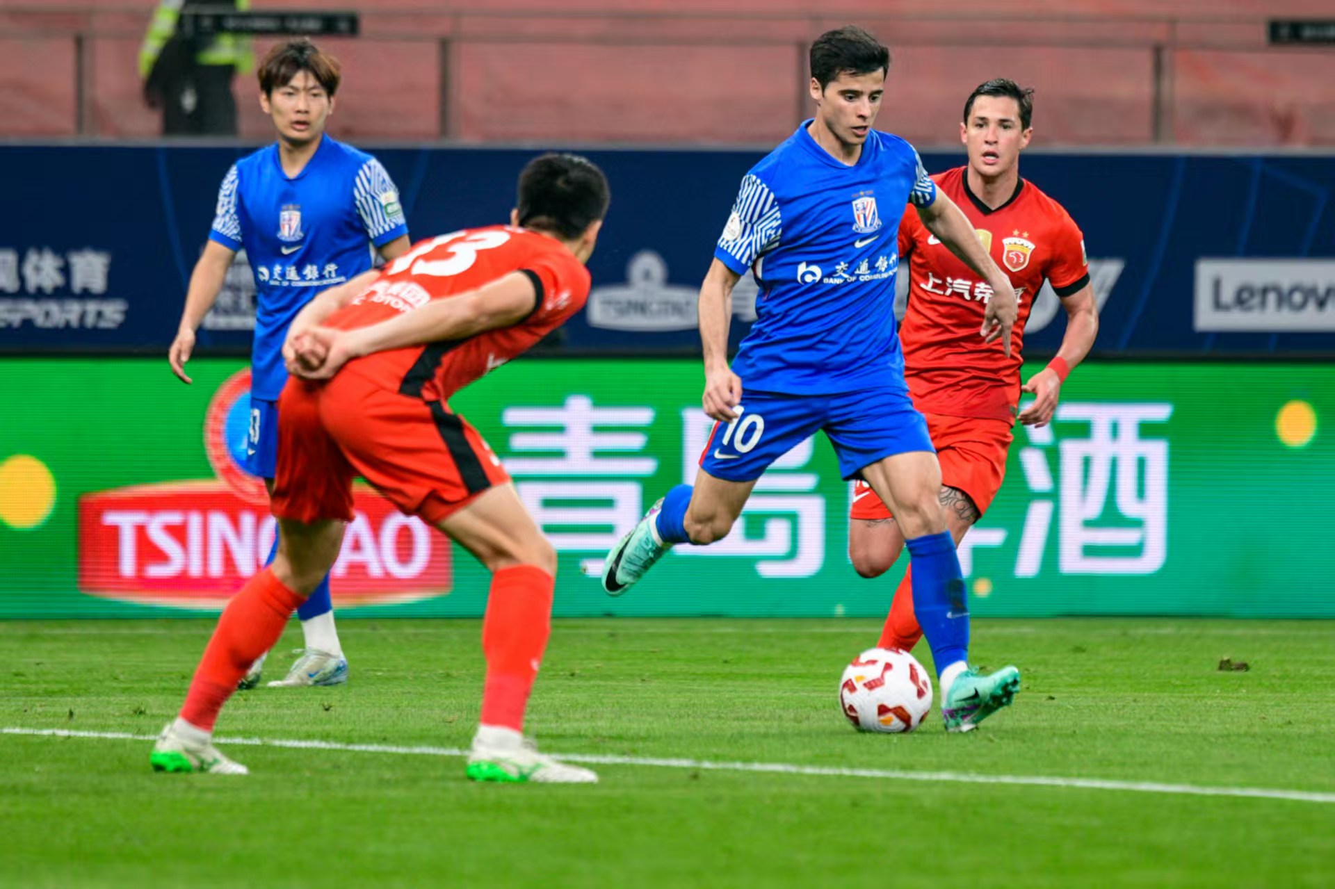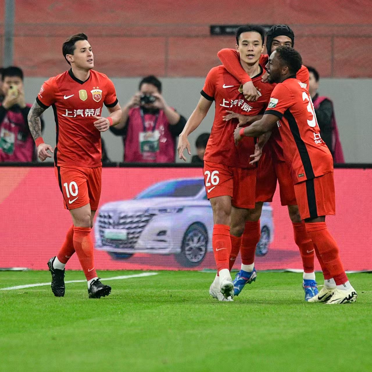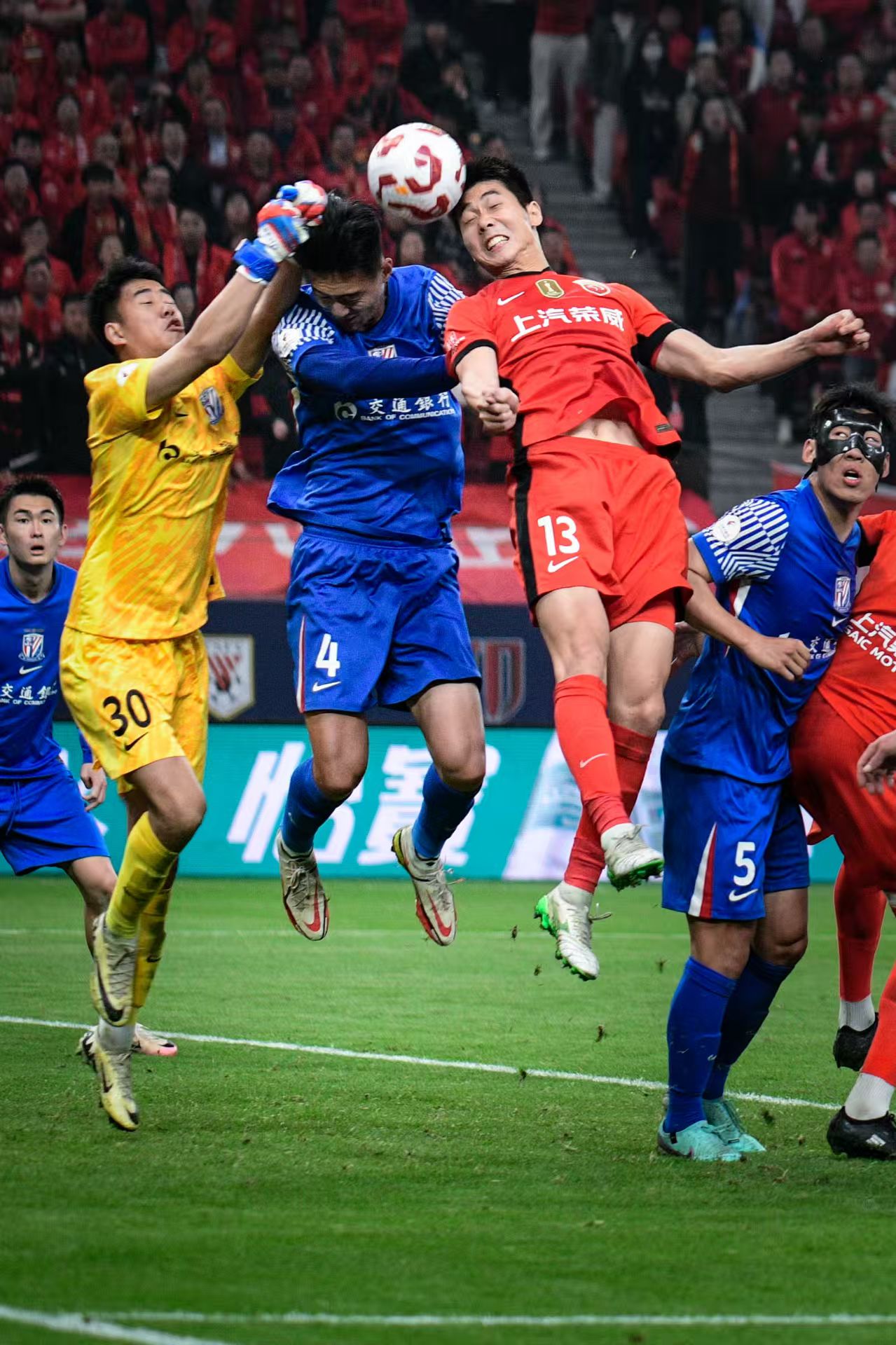 两支球队在上半场基本旗鼓相当,射门次数不多,但海港两次射正取得一个进球,申花则有两次击中门柱。