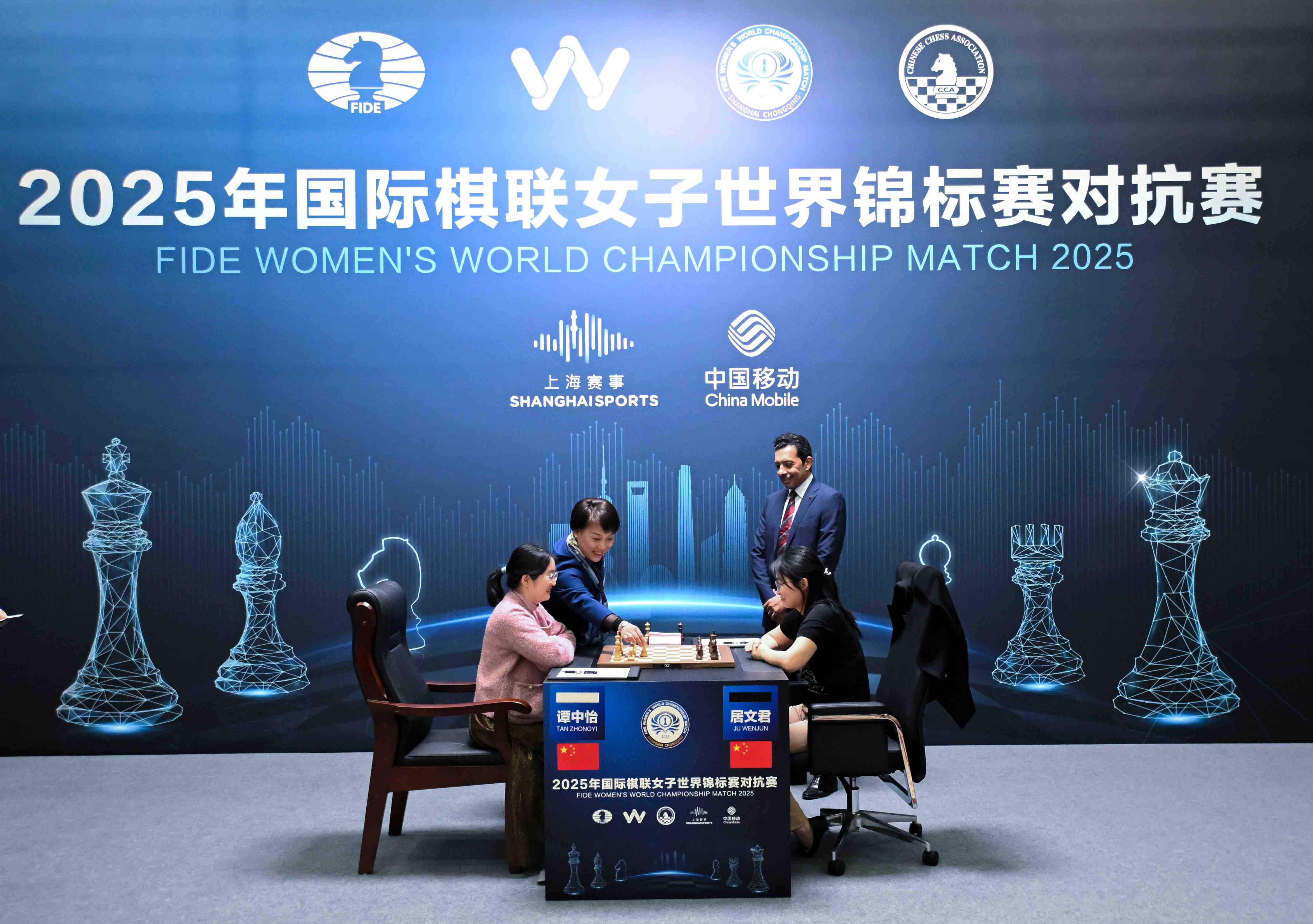作为女子国际象棋最高等级的较量,这项赛事的规格很高。赛事举办地设在上海棋院的二楼,棋桌后是两位棋手大幅照片构成的背景墙,将竞赛区域与背后的棋院工作区域隔离开来。