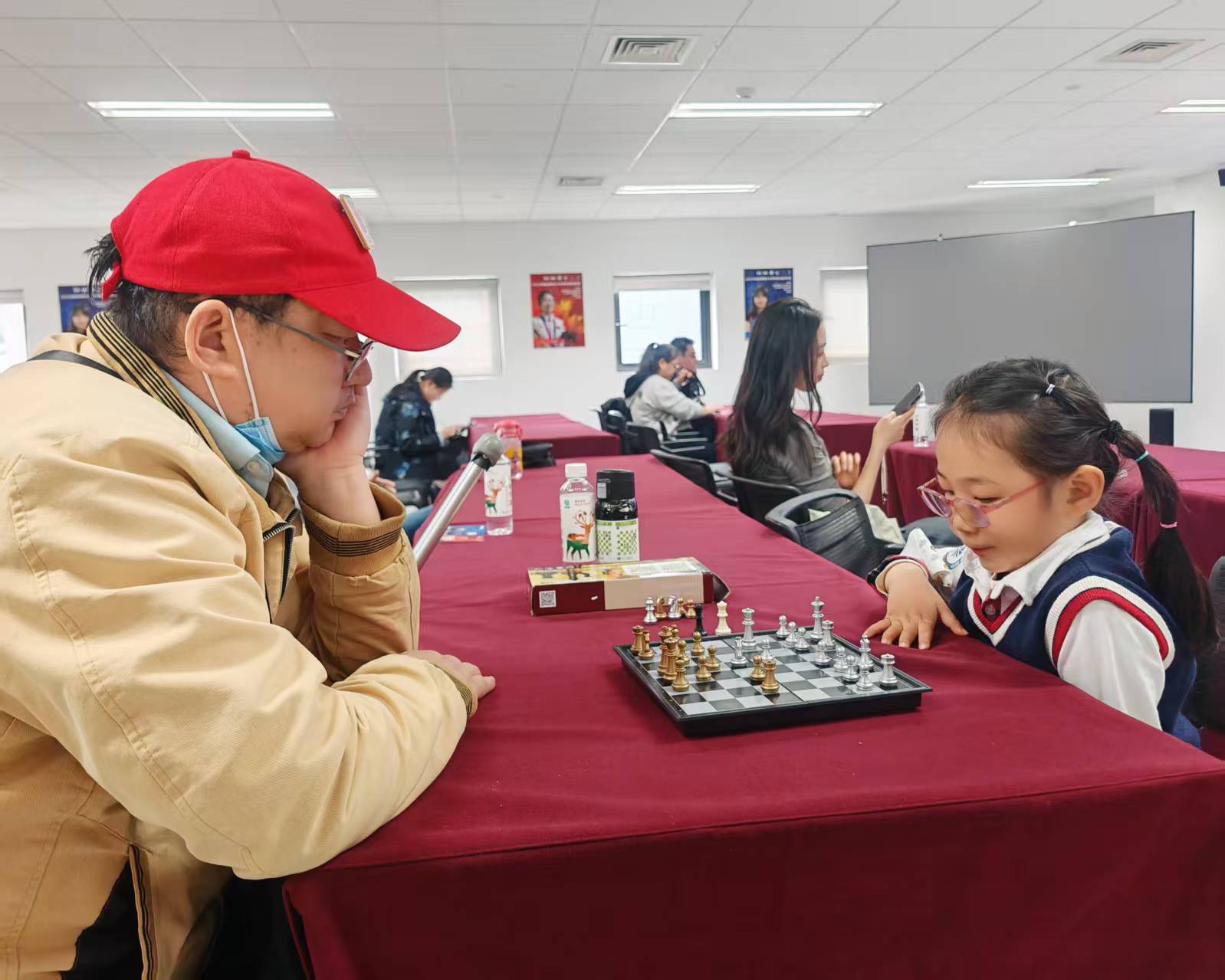 4月7日的第四盘较量,几位大学生棋迷在观战室下起了超快棋。来自东新幼儿园中班的王婉灵是现场年龄最小的观众,她也在现场与一位老棋迷临时对弈了一盘。
