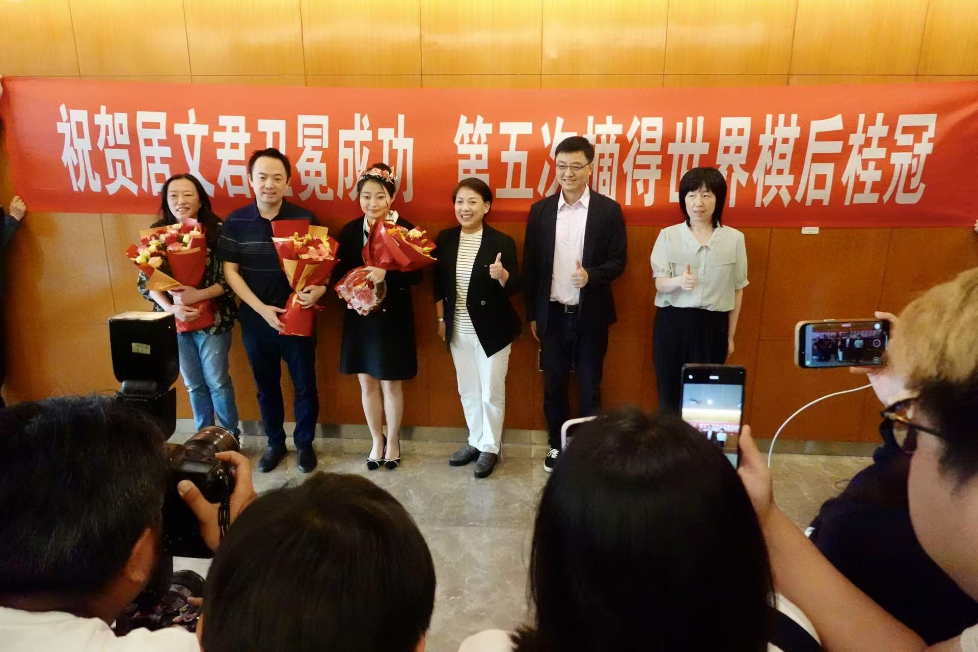 上海市体育局副局长宋慧、上海棋院院长刘世振等人迎接居文君。劳动报记者贡俊祺 摄影