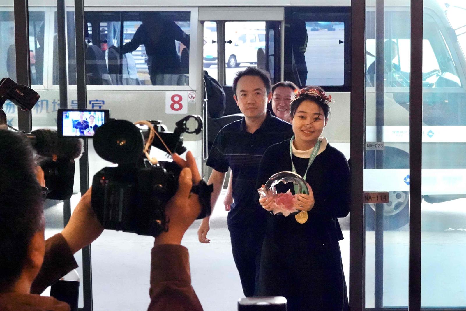 教练倪华陪同居文君一起走出机场。劳动报记者贡俊祺 摄影