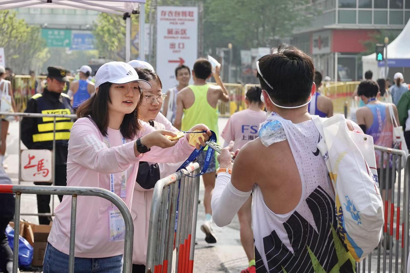 上马志愿者在终点处为完赛跑者发放奖牌。劳动报记者贡俊祺 摄影