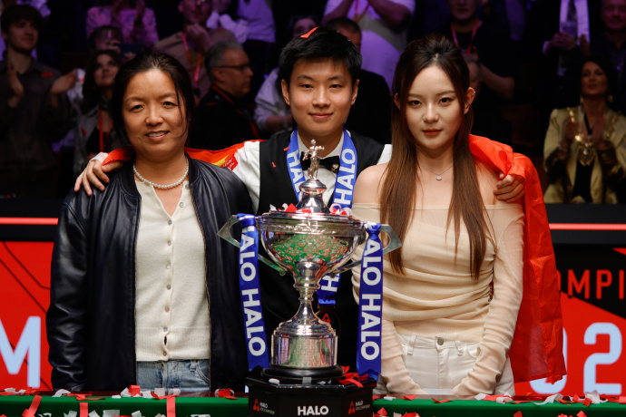 赵心童邀请经纪人和女友一起庆祝。世界斯诺克巡回赛官方图