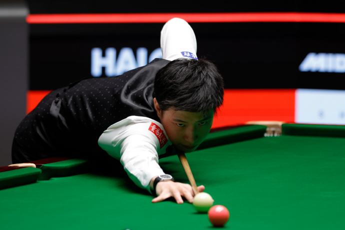 赵心童在比赛中击球。世界斯诺克巡回赛官方图