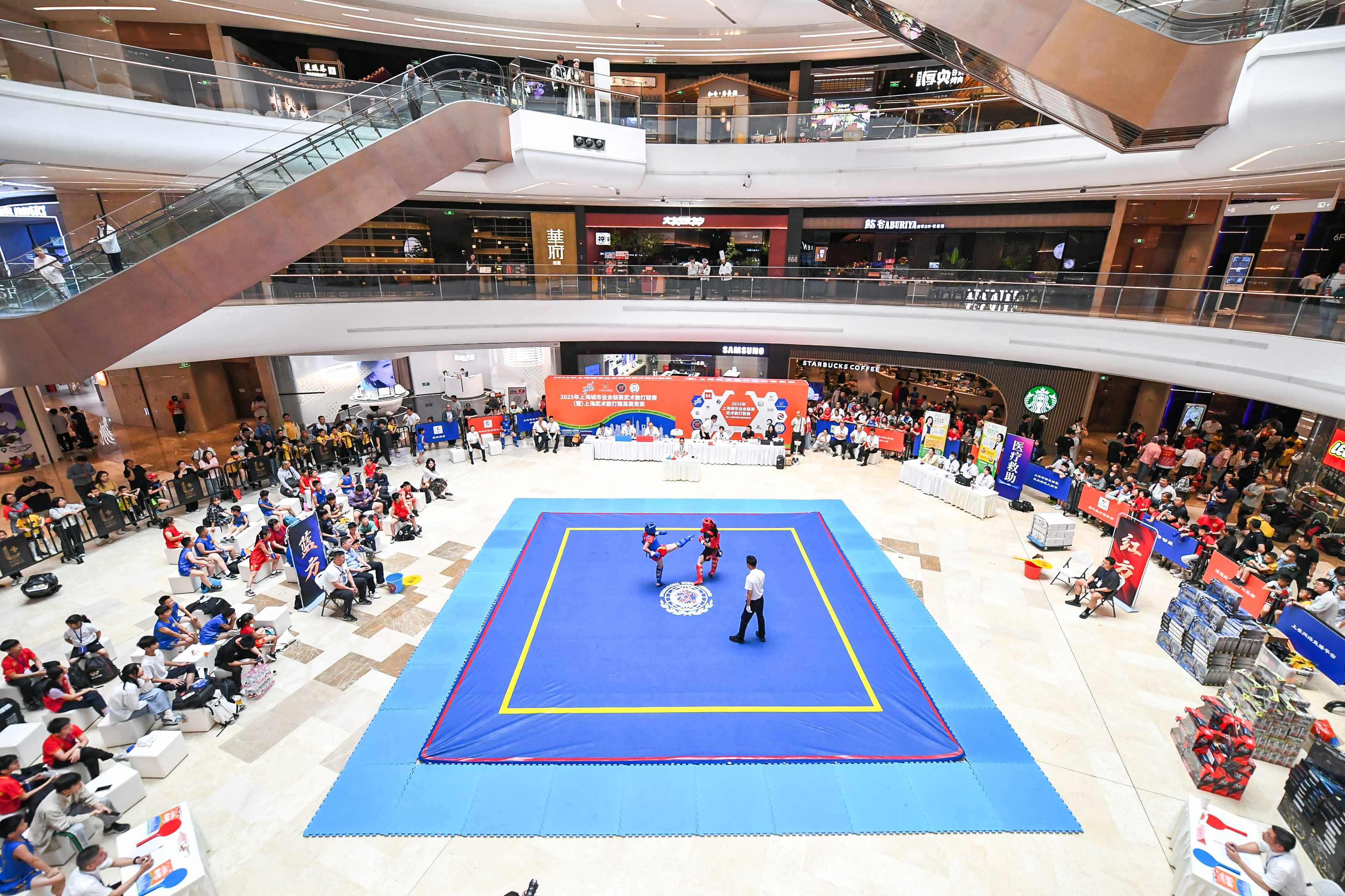 5月24日,2025年上海市城市业余联赛武术散打联赛暨上海市武术散打精英赛在陆家嘴中心广场5楼中庭火热开赛,来自全市19支队伍的300余名选手齐聚一堂,以武会友。