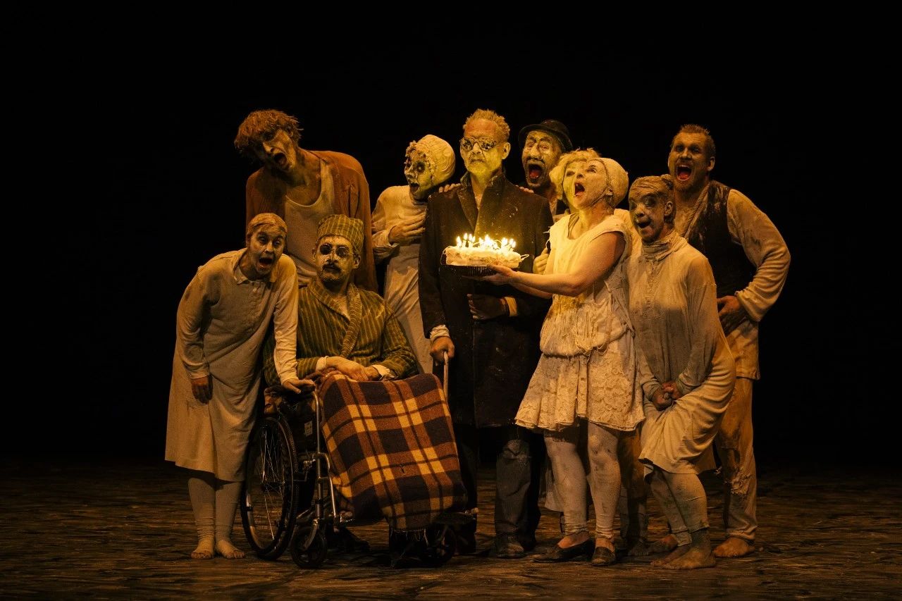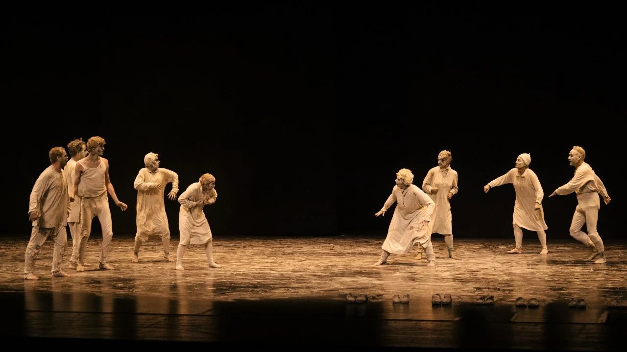 演出中,10位舞者作为贝克特笔下人物的集合体,全身涂白,身着不合身的睡衣,步调一致地拖沓前行。他们或随着哨声、鼓击节奏的进行曲踏出行军般的步伐,形如机械;或充满爱恨地分享生日蛋糕又饱受争斗谩骂,宛如流浪者;就连沉默也成为玛姬·玛汉的编舞语言,不时出现的等待和静止状态在剧场里营造出一种特别的虚无感,让观众沉浸于生命的律动和矛盾里。虽然这些舞者身体的“讲述”并没有连贯的叙事逻辑,但不断涌现的肢体动作却构成了一个尚未完全进化成人的生命逐渐成长为完整人类的过程。