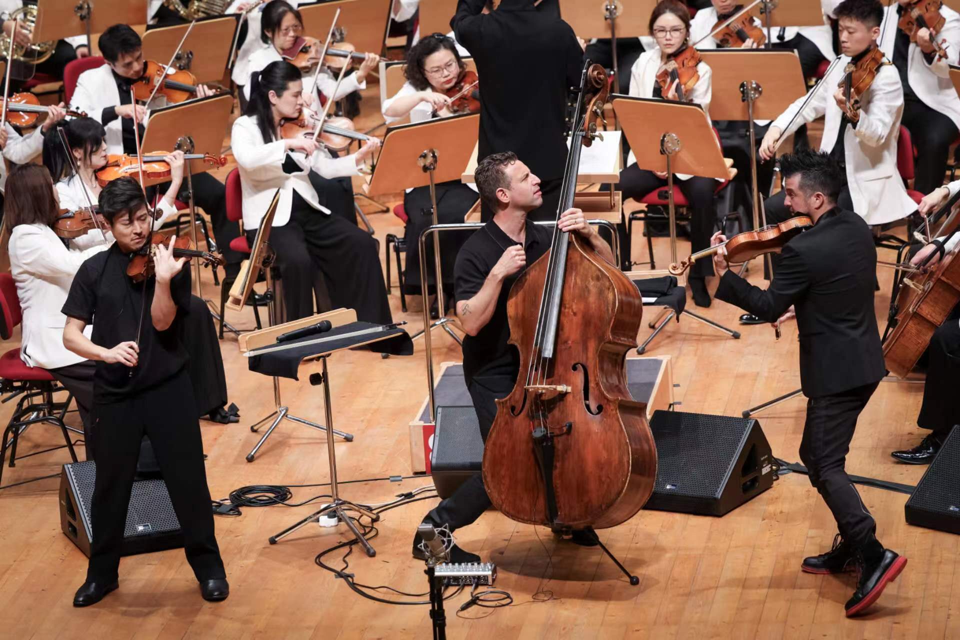 音乐会上半场,金郁矿还执棒上海交响乐团,联袂格莱美获奖组合“三人时光”重奏组共同演绎了凯文·普茨的《接触》。尽管是首度合作,台上的中外艺术家们却十分默契。“惊喜从排练时就开始了,指挥金郁矿那么年轻帅气,对待作品又非常认真专业,他乐谱上密密麻麻的笔记让人震撼。上海交响乐团也是一样,所有演奏家,有的讲英语,有的讲汉语,有的讲日语,但是只要走上舞台,音乐就是大家唯一的共通的语言。”小提琴家尼古拉斯·肯德尔如是感慨。