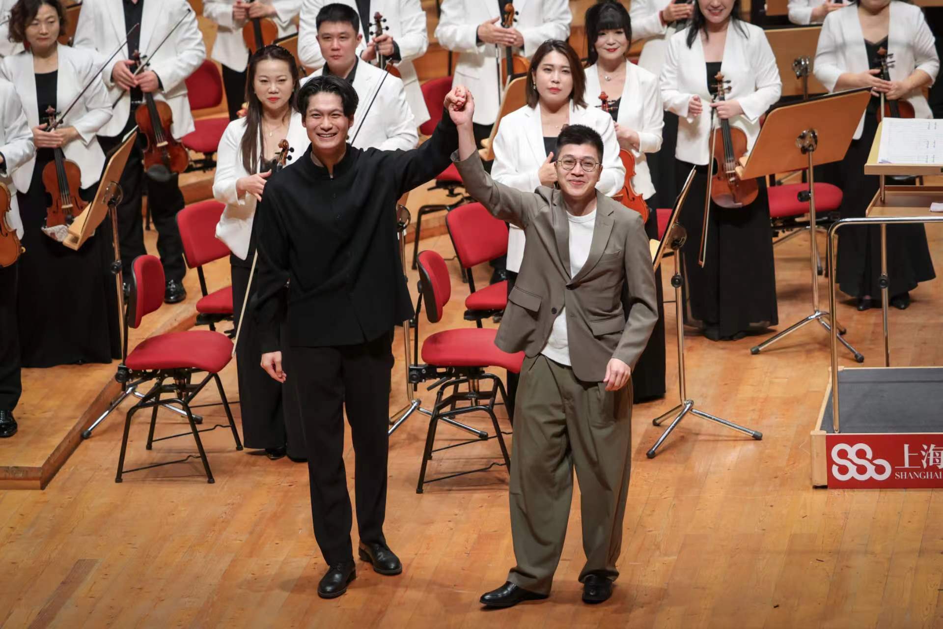 00后指挥家金郁矿(左)和青年作曲家梁皓一。上交供图