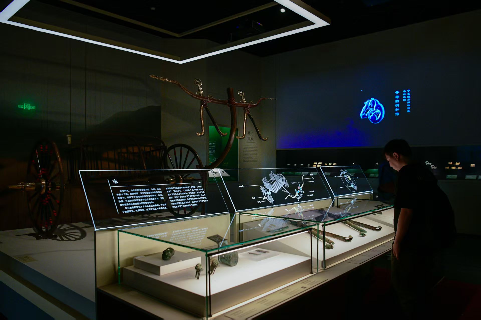 本次展陈设计充分依托建筑格局打造出一个无柱的展览空间,构建开放式的空间布局与非线性的参观动线,融合型、色、视觉单元、场景营造以及多媒体辅助阐释等多种要素,紧密围绕展览主题与叙事内容,将空间叙事进行可视化转译。展厅以“三角形”作为核心视觉符号,通过二维与三维的表现手法,使其贯穿始终,隐喻固原在地理、历史、军事、贸易、文化交流等诸多方面的重要地位;同时,展览结合三个部分的 内容,分别选取绿色、黄色、红色作为各单元主色调,色彩整体典雅明快,与固原在西周、北周、隋唐三个重要时期所呈现出的初步发展、壮大交流以及强盛包容等特点相互呼应。
