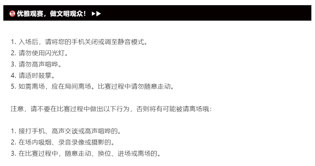1.务必带好身份证件。本赛事实行实名制身份证件比对人脸入场,观众需携带本人身份证件原件,以便顺利核验入场,享受这场视觉盛宴。
