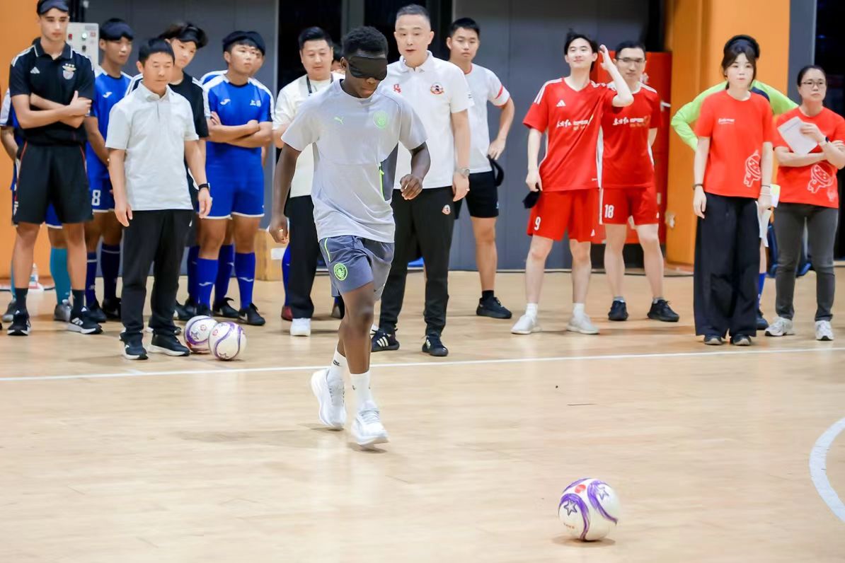 头图为来自国际豪门足球队的青训新星与上海盲人足球队切磋技艺。主办方供图