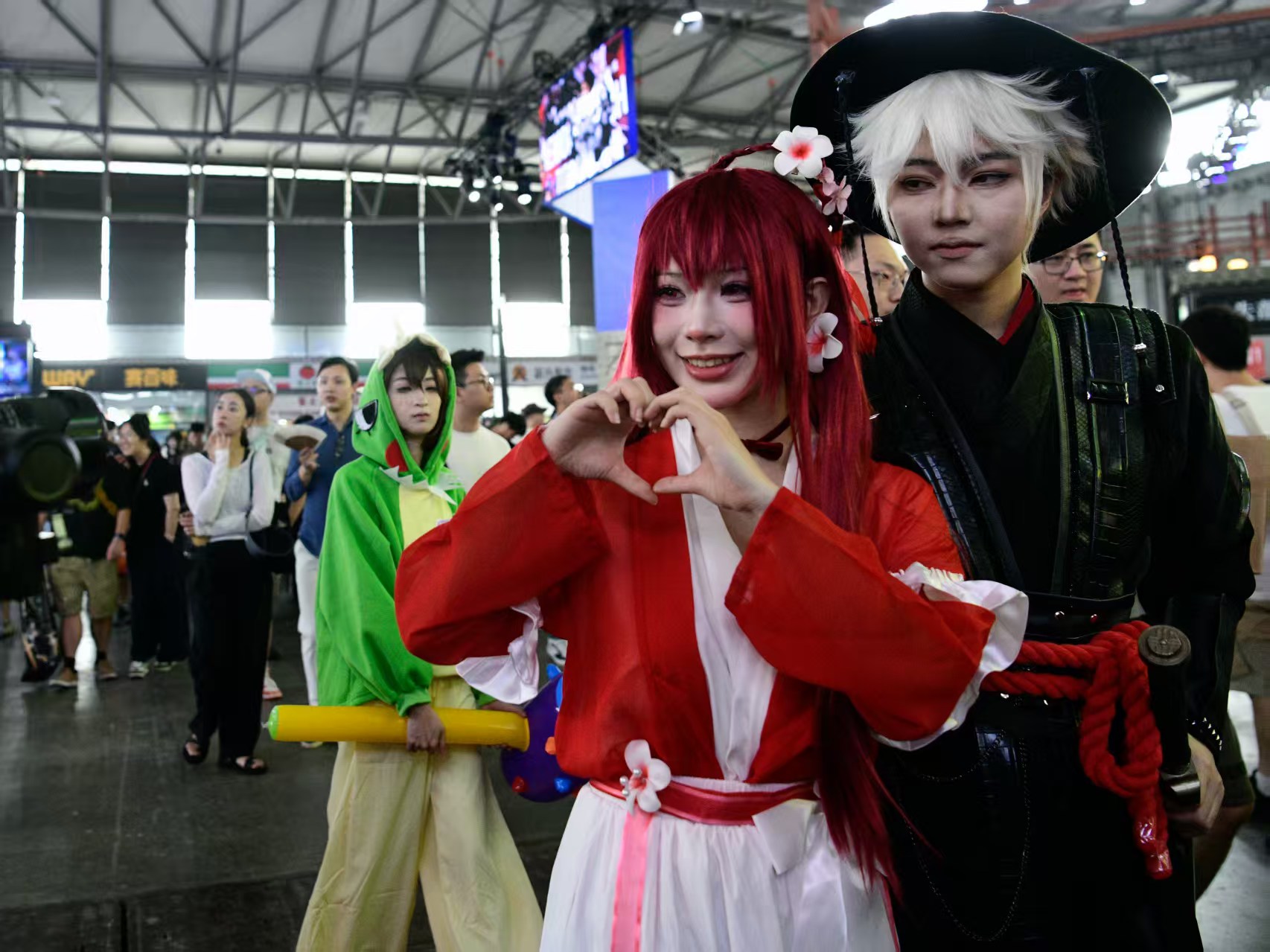 盛装打扮的观众向展会“比心”。劳动报记者颜筱依摄影