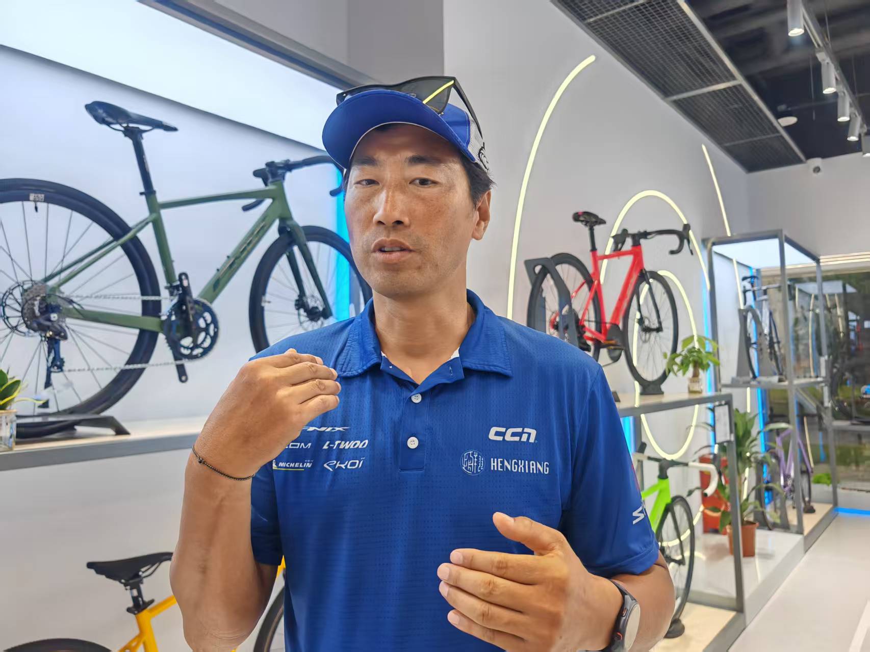 薛佳琛(右)科普各种类型自行车的区别。久事体育图
