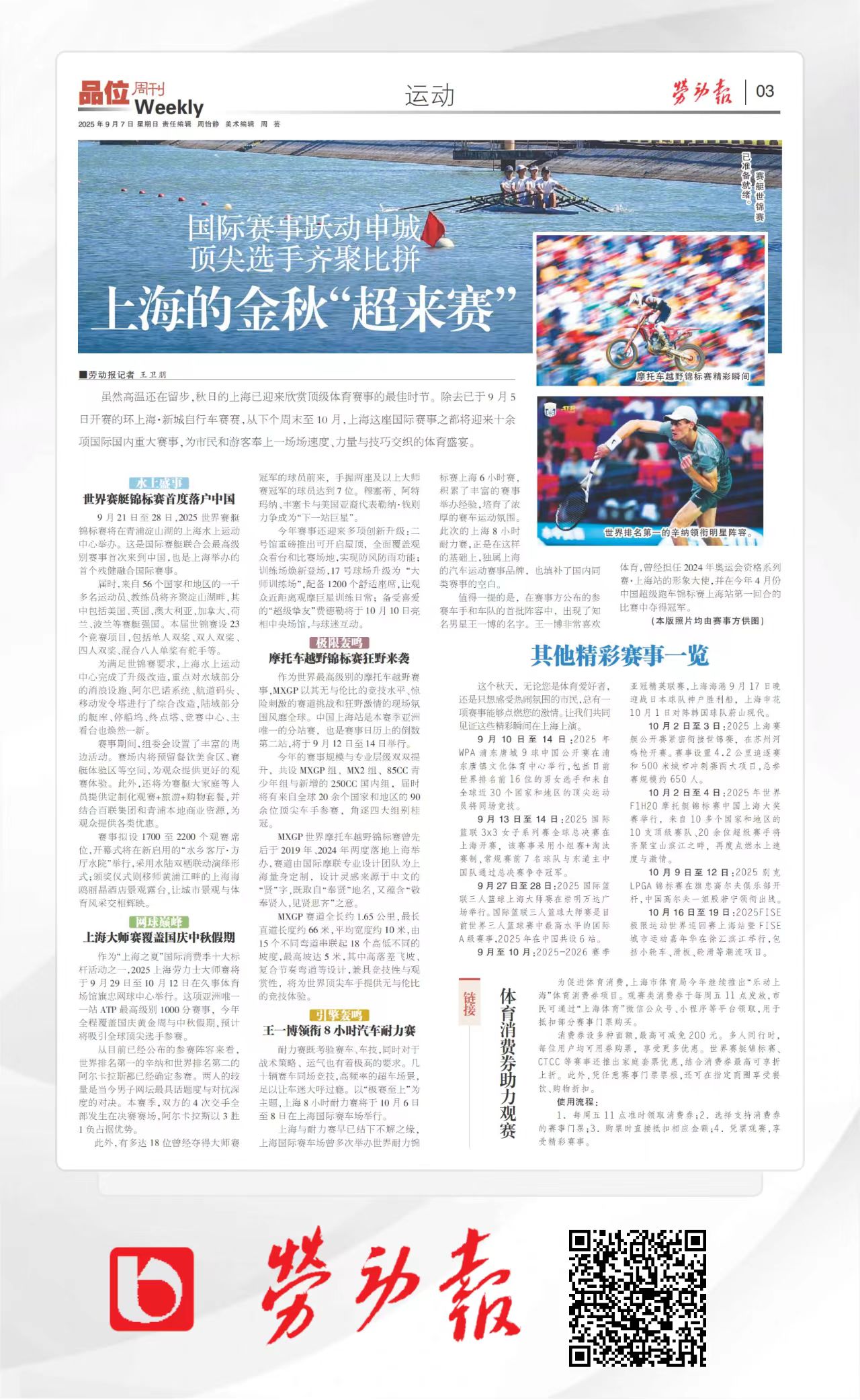 劳动报在9月7日的《品味周刊》上对接下来一段时间的上海精彩赛事进行了详细介绍。