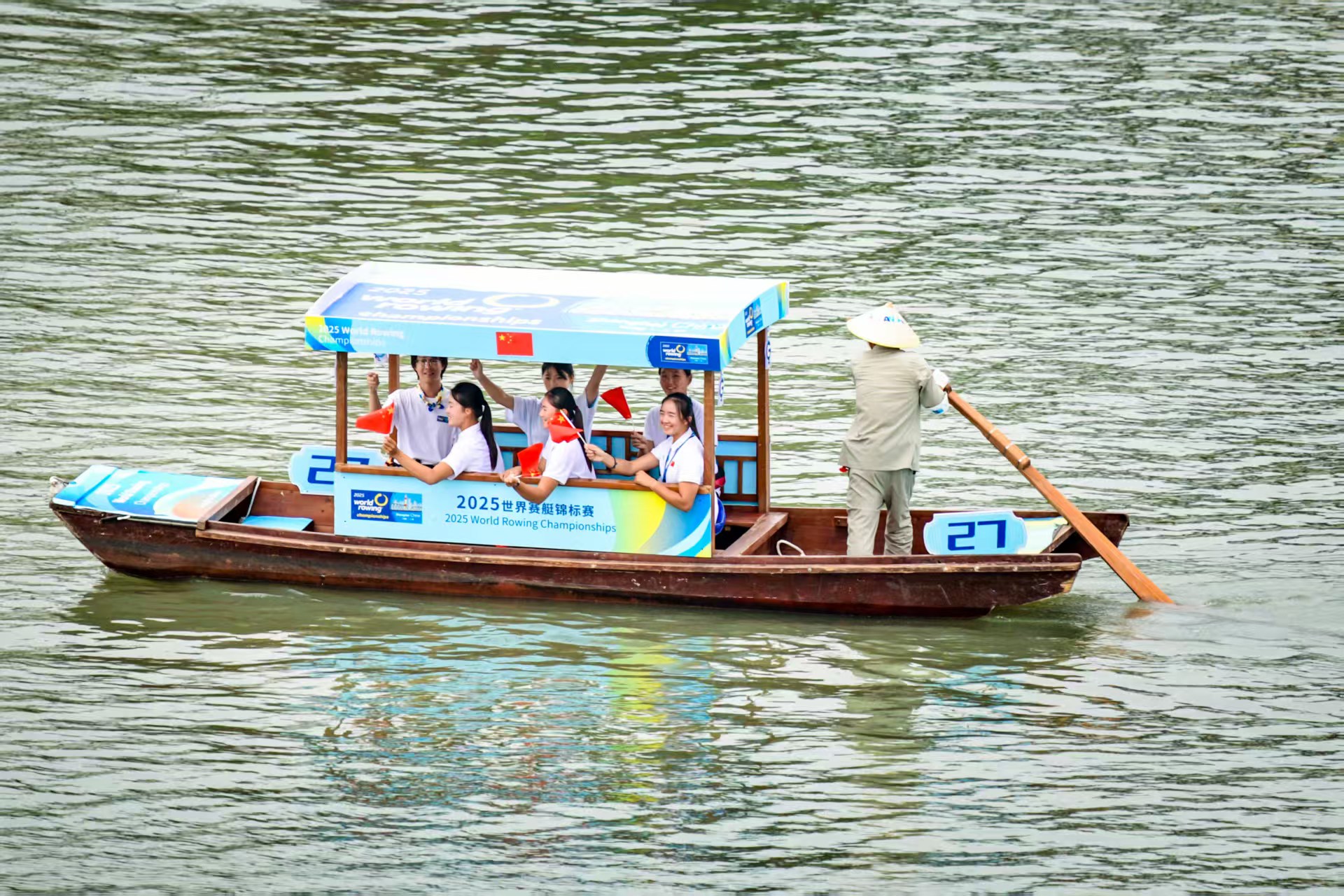 运动员入场环节则把江南韵味拉满。全球健儿乘坐定制摇橹船,从水上缓缓驶入主舞台,船身装饰的赛事LOGO与队员服饰相映成趣,完美诠释“水乡遇见赛艇”的创意。