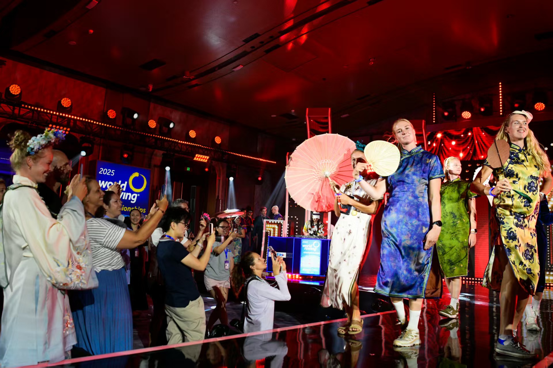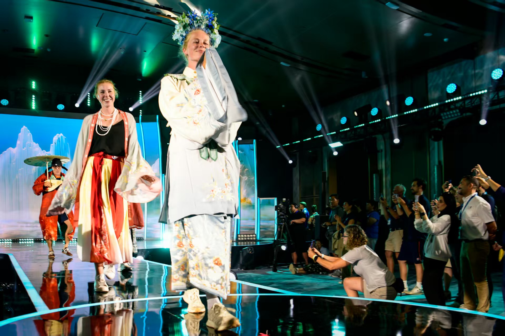 赛事的闭幕式同样新意十足。在开幕式就大放异彩的机器人“艇艇”伴随着歌声舒展灵动的身姿,随后,各国运动员换上不同款式的中式服装,身材原本就堪比“超模”的他们大方上阵,来了一场中国风大秀。