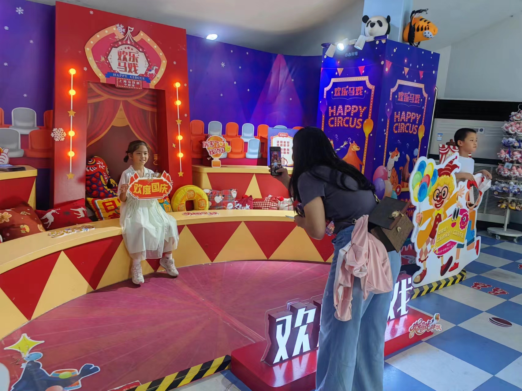 小朋友在《欢乐马戏》的互动体验区打卡拍照。劳动报记者马亚会 摄影