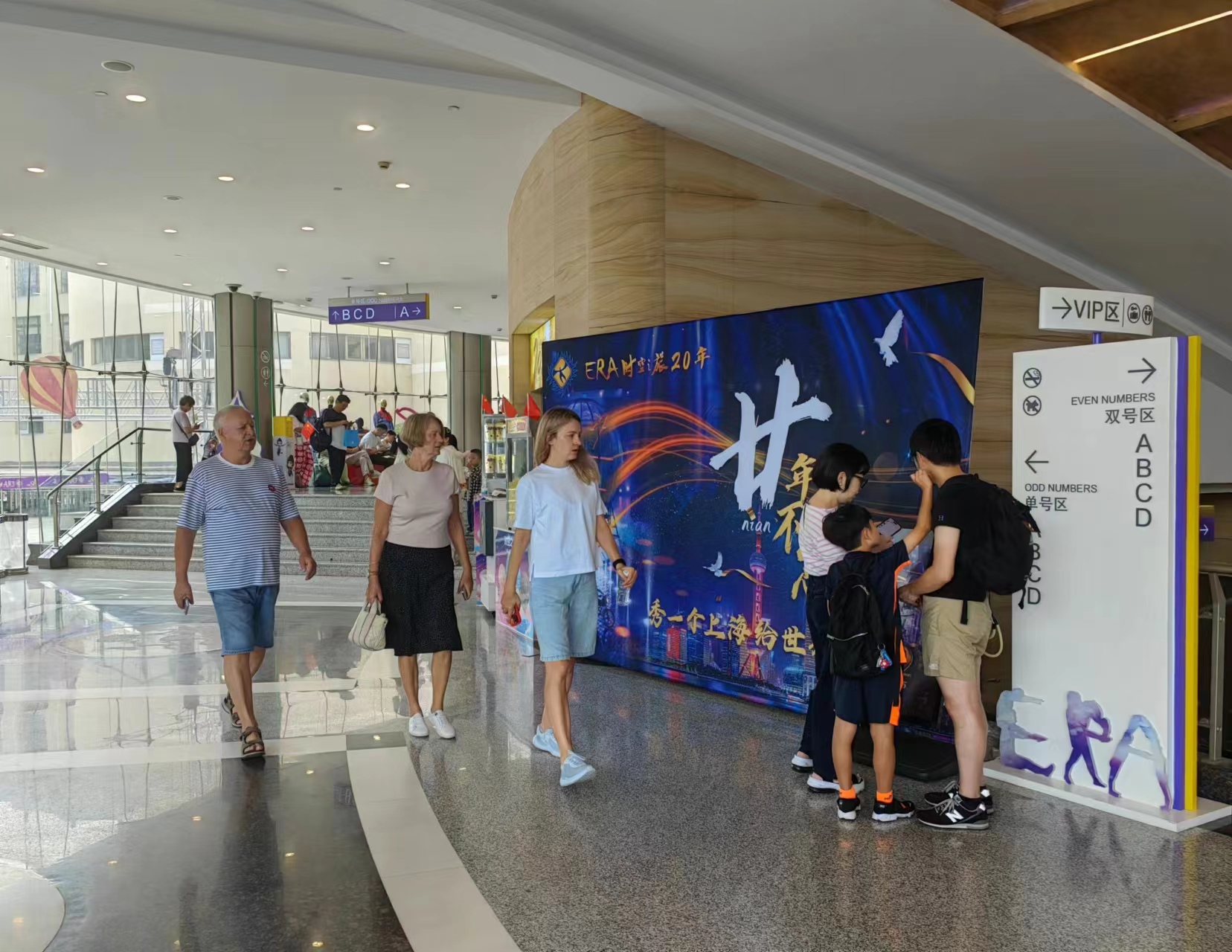 假期第一天,家住浦东的王岚就拖着两个行李箱匆匆赶来,身后三个孩子笑意盈盈,这是他们第一次在剧场里过节。尽管坐了70分钟的地铁,但满脸的兴奋劲儿丝毫不减。“今年国庆我们计划去江苏逛逛,因为马戏城距离火车站很近,下午场的时间也合适,看完演出再启程旅游两不耽误。”于是,《时空之旅》成了他们的不二选择。“读书的时候就听说过,一直没机会看,到这儿才知道已经演了20年了。”站在剧目展板前,王岚感叹着时光飞逝,身边不断有外国游客经过。