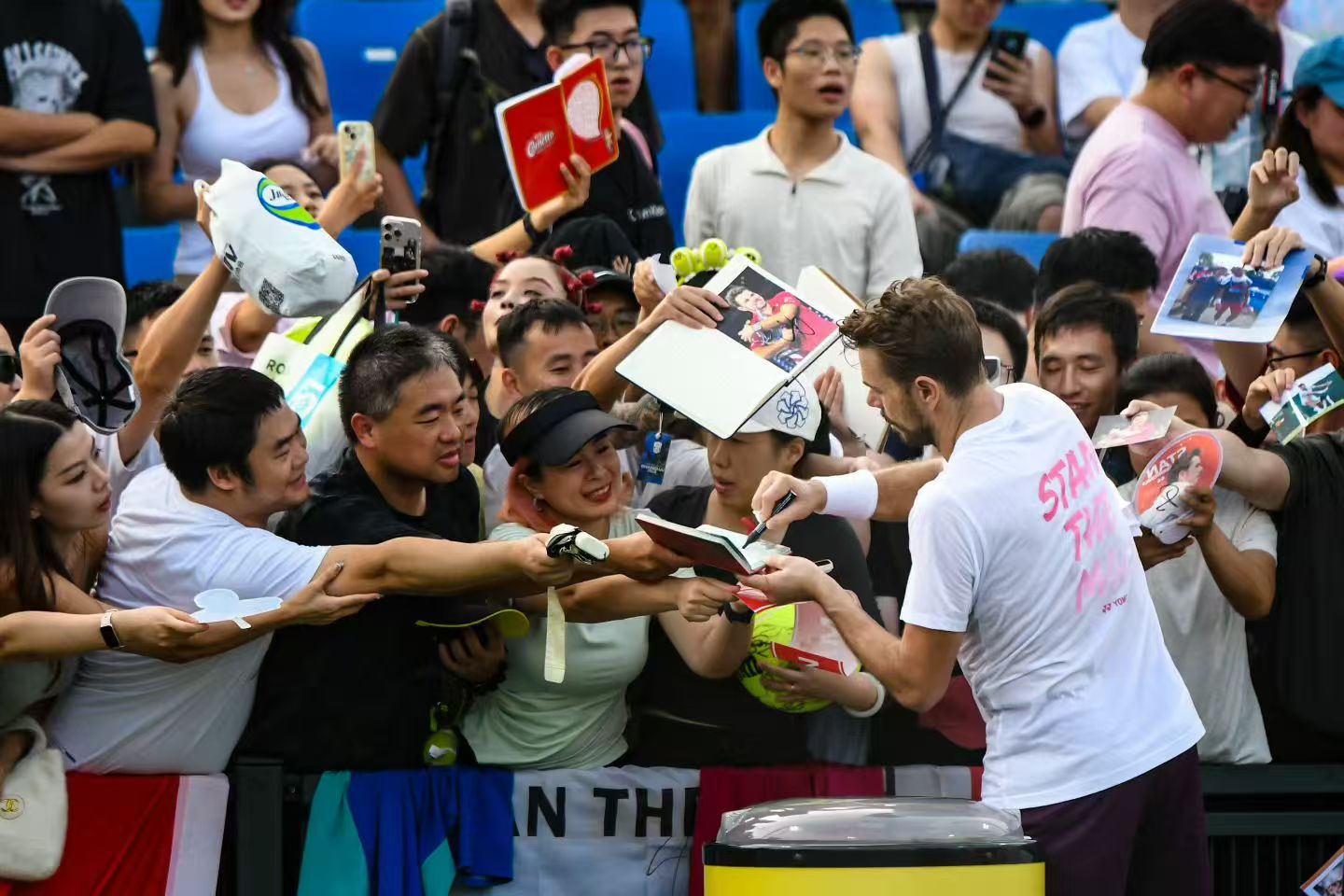 2号馆前的“传・旗”20周年主题展中,甄选的球迷藏品与历史影像重温着从上海喜力网球公开赛到如今大师赛的经典瞬间。球迷蔡梦艳把自己珍藏的票根拿了出来,知名穿线师阿发则借展了从纳达尔球拍上剪下的用线。