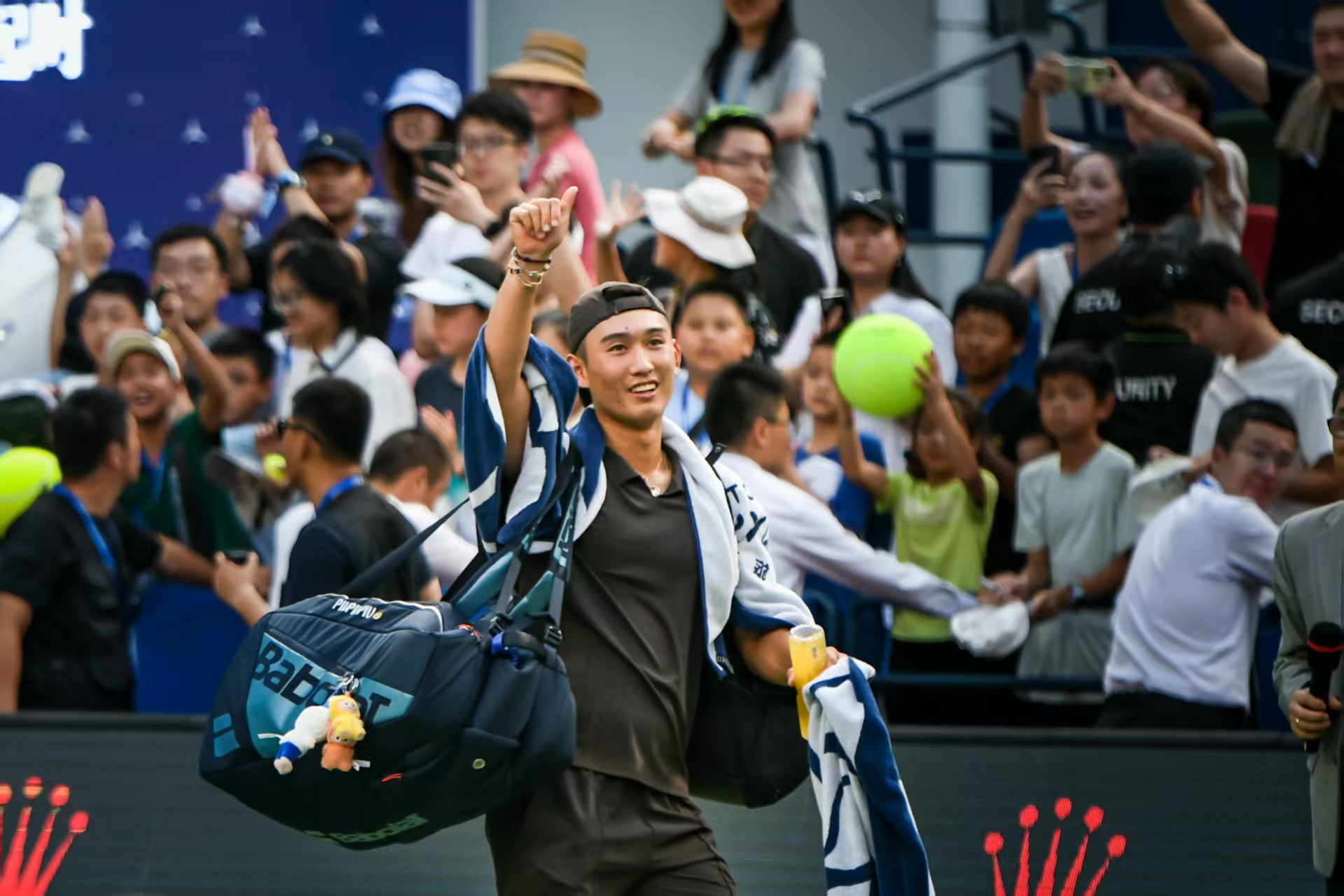 商峻程向球迷示意。劳动报记者颜筱依 摄影
